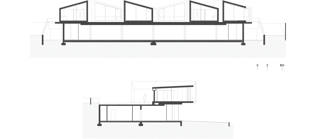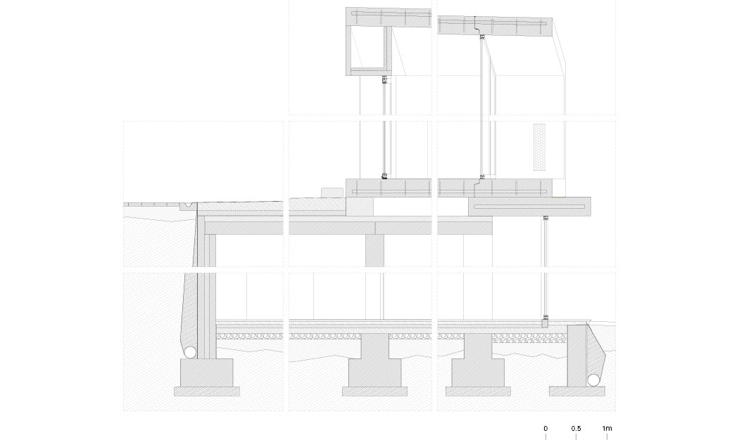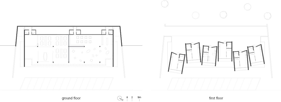 The strategy was clear: a ground floor level for a multi-services program, connected with the public space and crowned by the individual habitational units (six cabins of 45m²). Due to the differences between these two programs, the building was created with independent access for each one, placing the different programs at different levels and taking advantage of the natural slope of the ground.