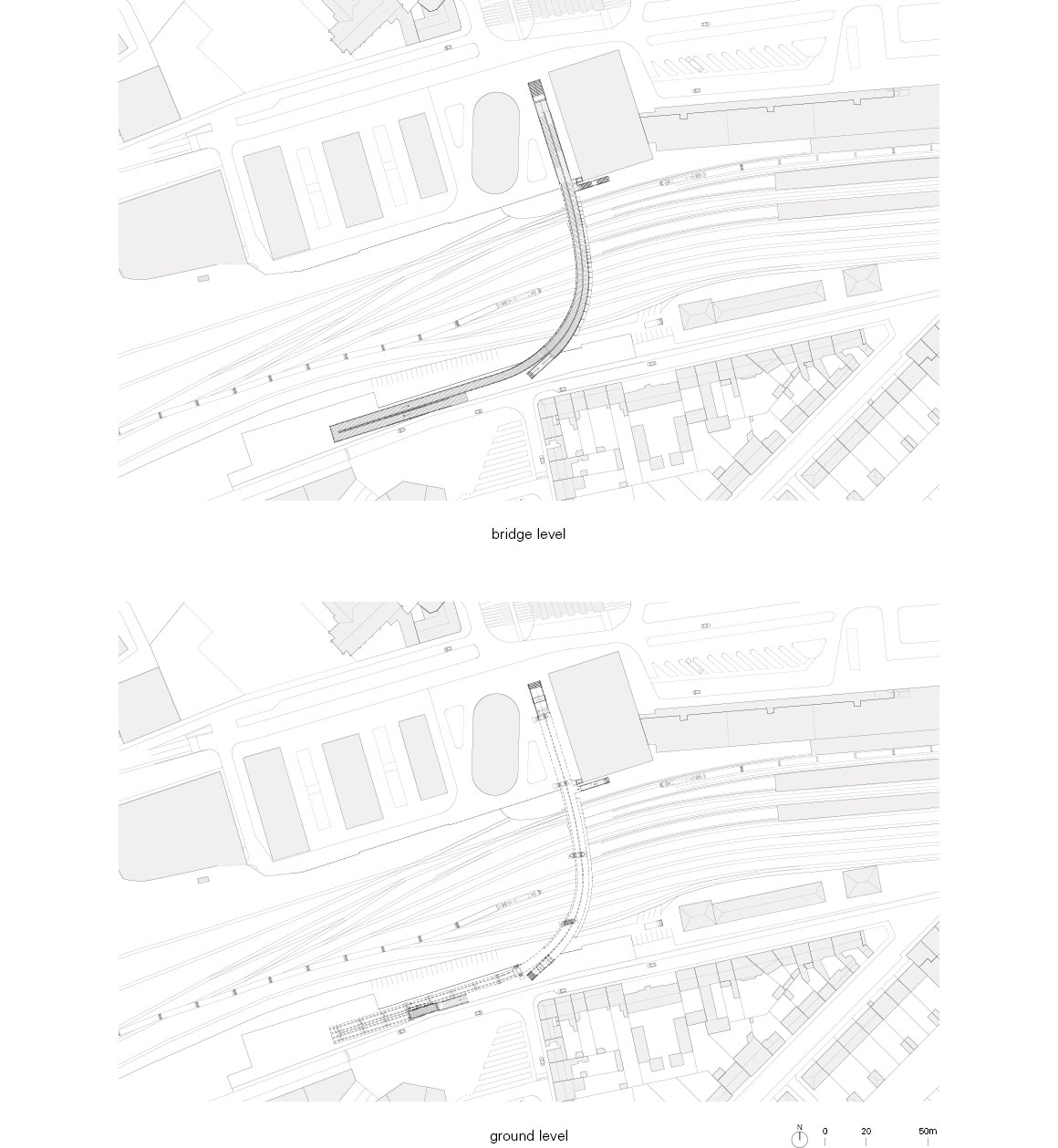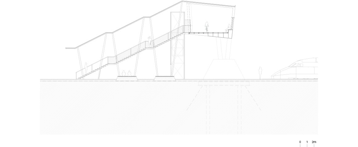 The new bridge is characterized by a soft, wide arch that crosses the entire width of 70 meters, carved into the topography of the city by the bundles of rails. These cables cut a deep corridor running towards the city. This replaces the old reinforced concrete pedestrian bridge, crossing directly over the tracks, which was badly damaged.