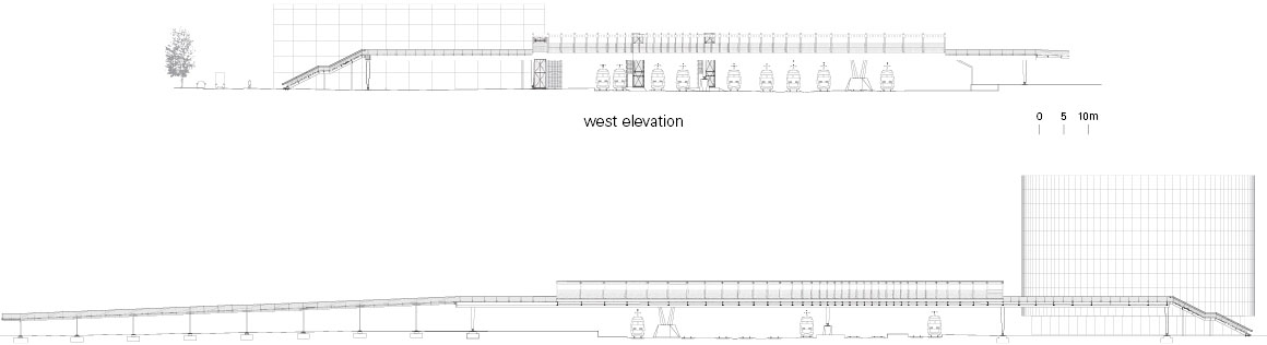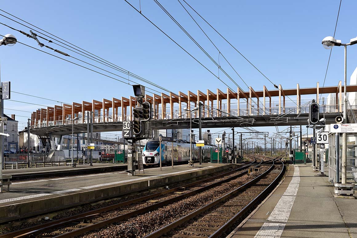 The urban development plans include an upgrading of the area. On the railway station side, offices and a multi-story car park have been built on Rue Auguste Gautier, and a hotel is under construction. To the south of the bundle of tracks, a new promenade and park will be built. Dietmar Feichtinger Architectes’ bridge design is based on the urban scale, overcoming the barrier of the railway tracks and providing direct access for disabled people to the platforms via lifts and stairs. These three lifts and stairs create a direct, obstacle-free and bicycle-friendly connection with the station and hotel, as well as with the platforms of the trains to Paris and Nantes. In its aesthetics, the bridge is an expression of the renewal of the Station district.
