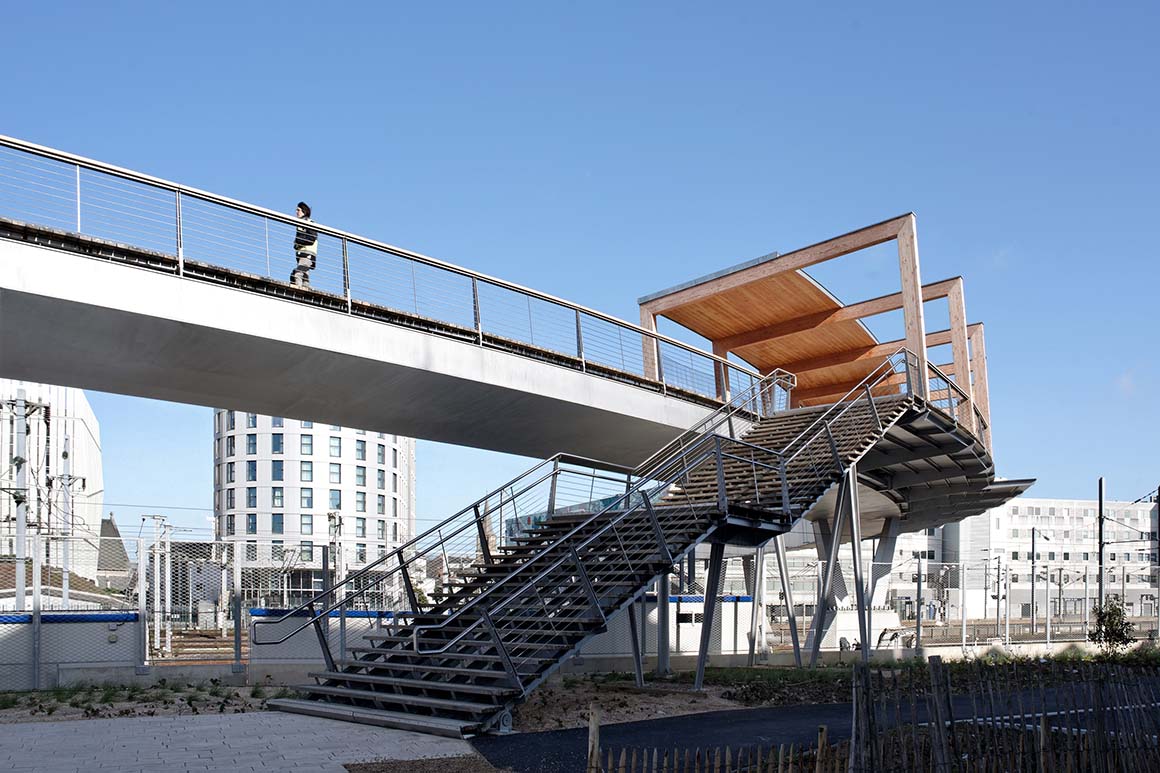 Above all, the bridge is a singular traffic structure that becomes a landmark with its gently curved path, its constructive elegance and the remarkable laminated wood porticoes that support both the lighting and the flat roof. These wooden frames not only shape the relationship between the passers-by and the place, they also have a specific function: they serve to integrate lighting while protecting against weather and wind. These elements are integrated into their construction. Anti-slip strips are embedded in the wooden footbridge, ensuring that the bridge can be used safely even under bad weather conditions. The varying distances between these punctuated images of the path offer different views of the tracks, the trains and the city. Benches along the balustrades invite you to sit down. The bridge becomes a path and a place.