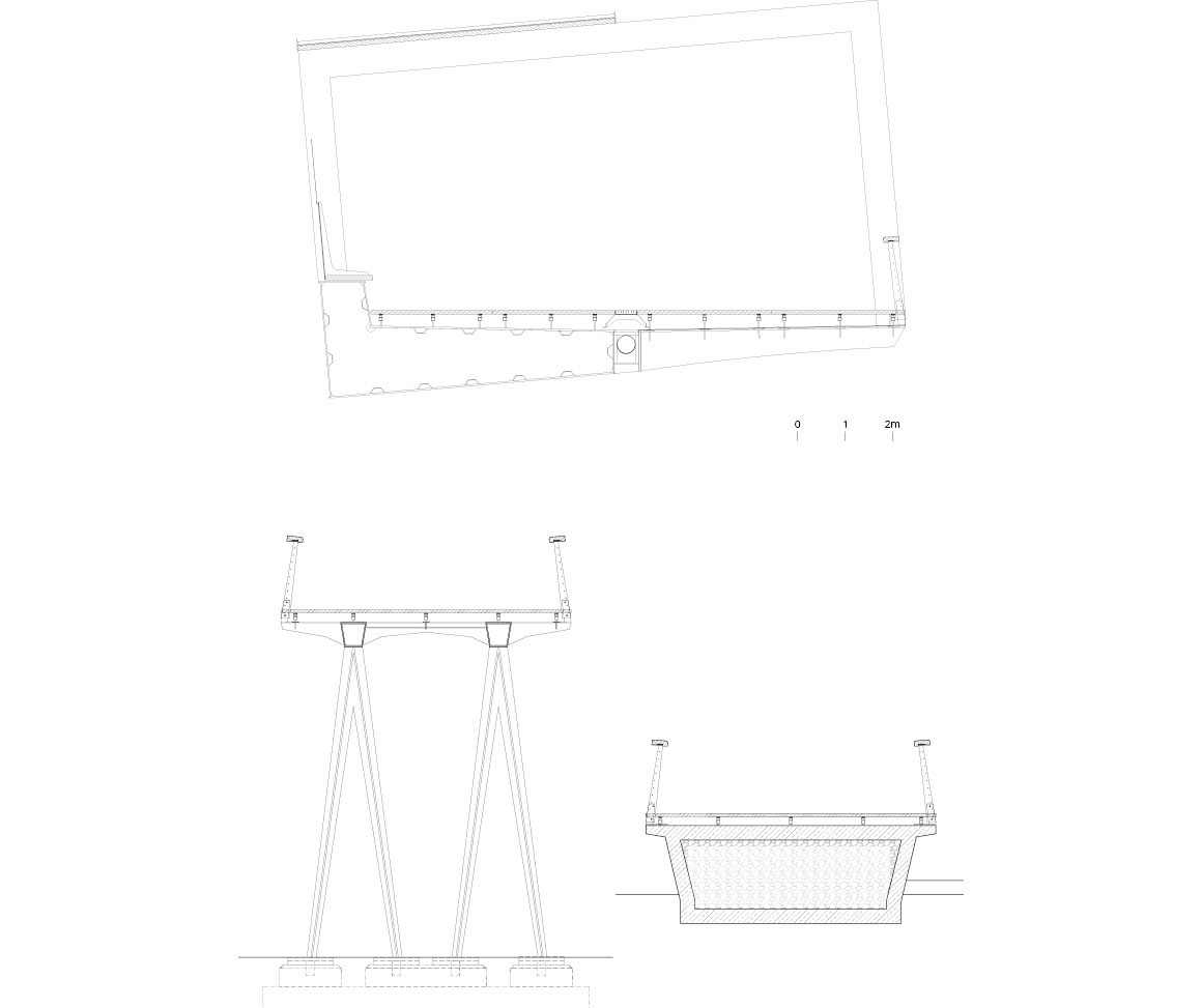 The substructure of the bridge consists of a hollow box and steel brackets in which benches with wooden seats are integrated.