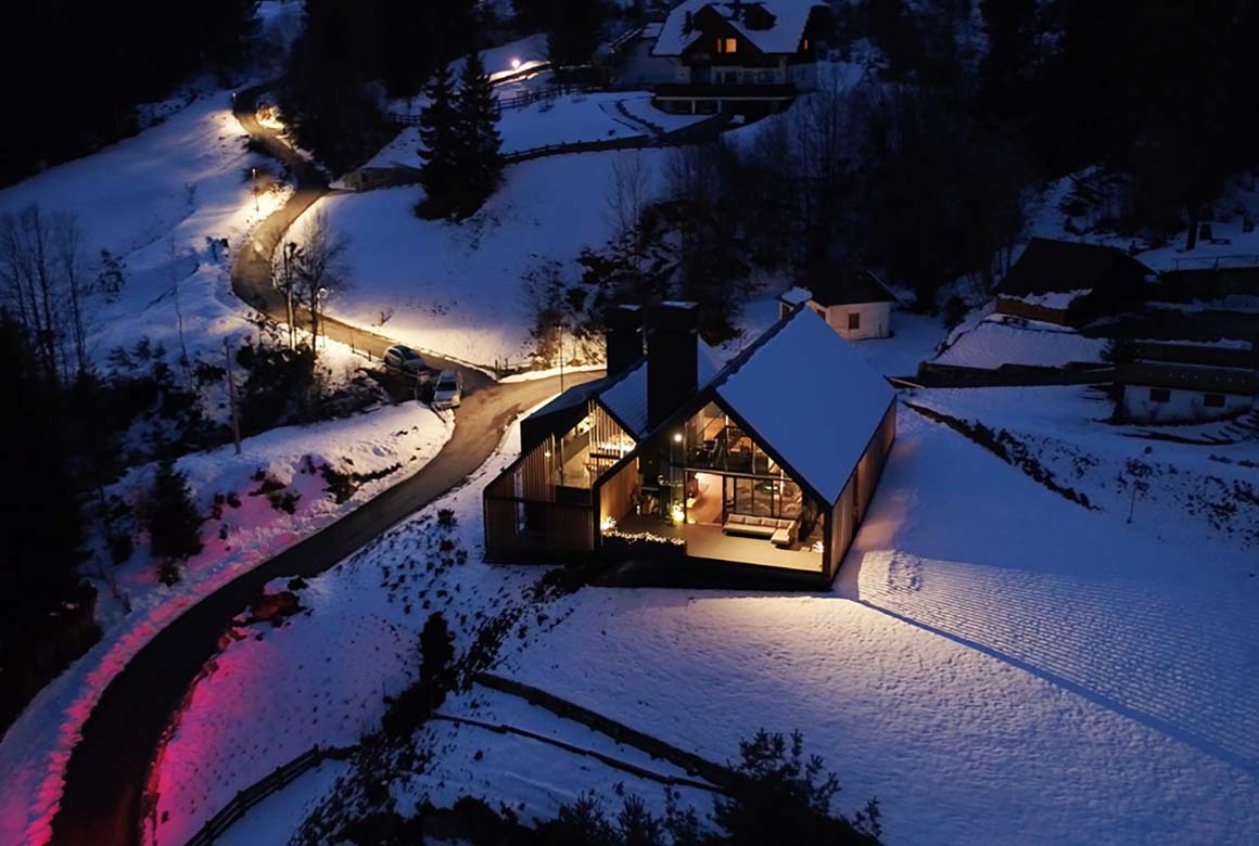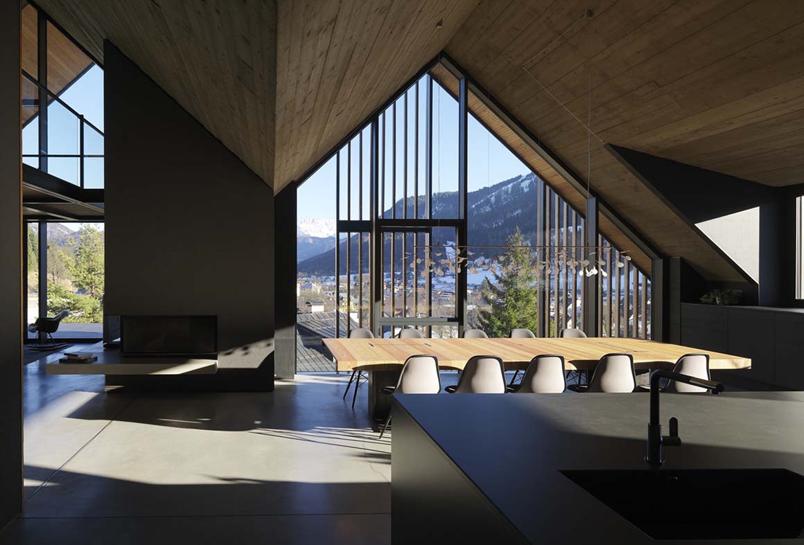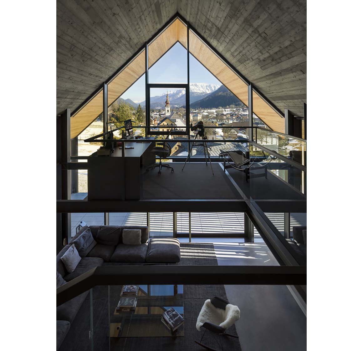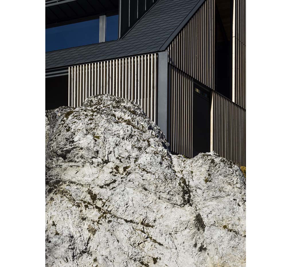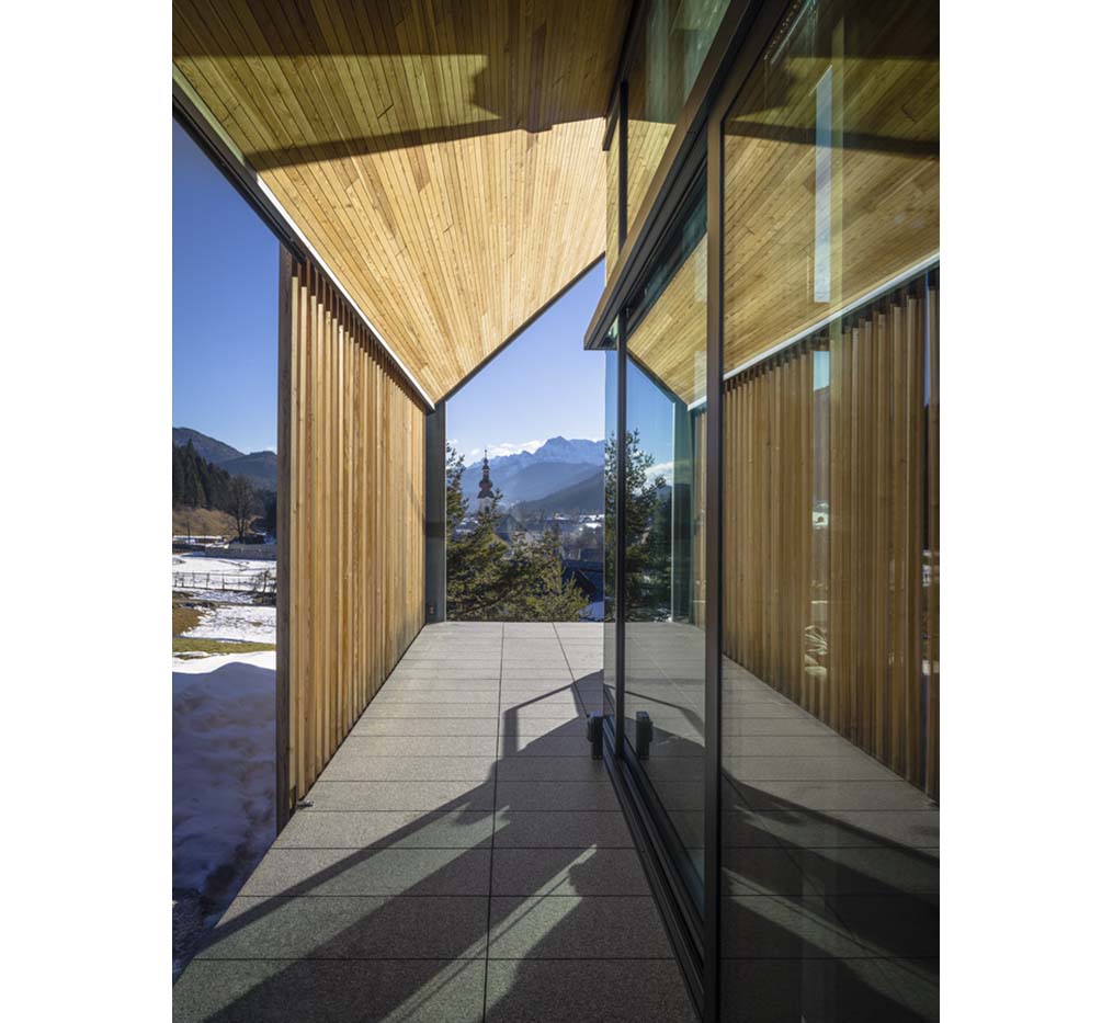 These wooden blades have different orientations. They condition the internal relationship between inside and outside, allowing constant light changes on the outer skin to create subtle and iridescent vibrations with the bright light of the Alps.