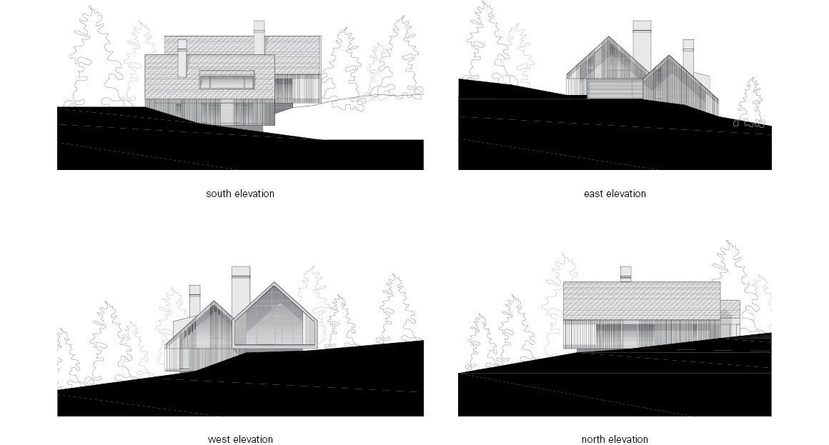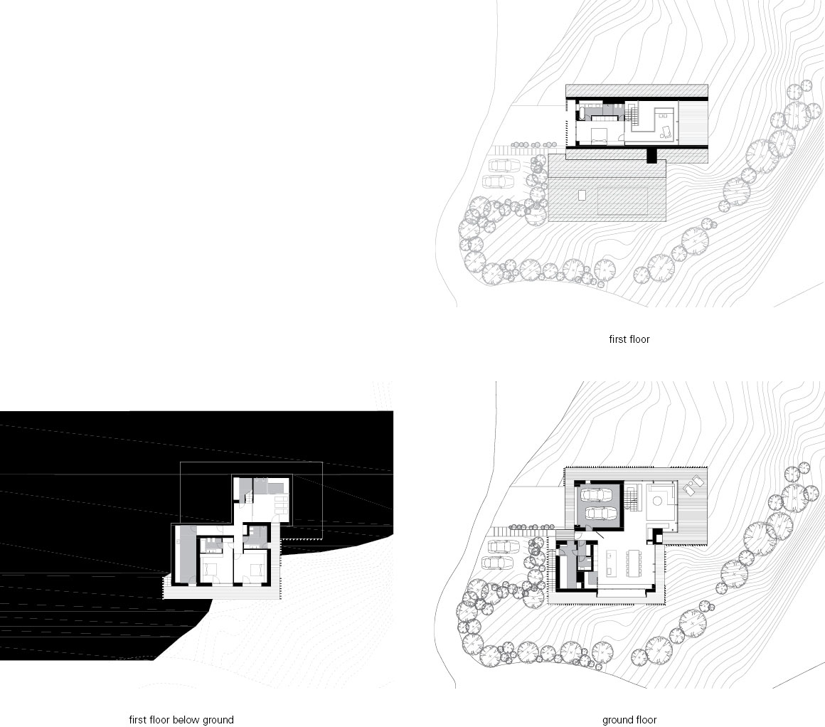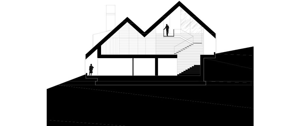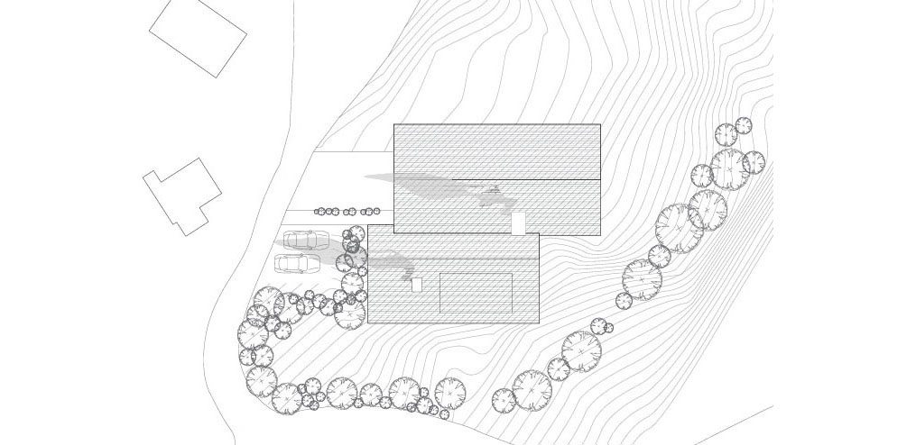 The functions requested by the owners are divided into a plant with two juxtaposed volumes that are divided into sections with different heights, which follow the contours of the land.
