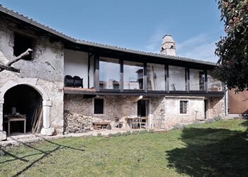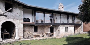 The house measures 450m2, distributed over five modules, the biggest of which is the living room with glass walls and ceilings. It is protected by an exoskeleton structure made of round sticks, that functions as brises-soleils controlling the room’s internal temperature in the hot summer months without resorting to air conditioning systems.