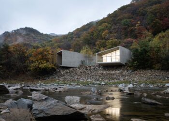 Juxtaposed with the exposed concrete and the four geometric ‘ribbons’ BCHO Partners Heyri Theatre is...