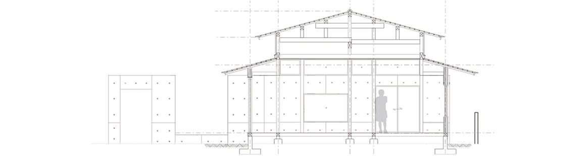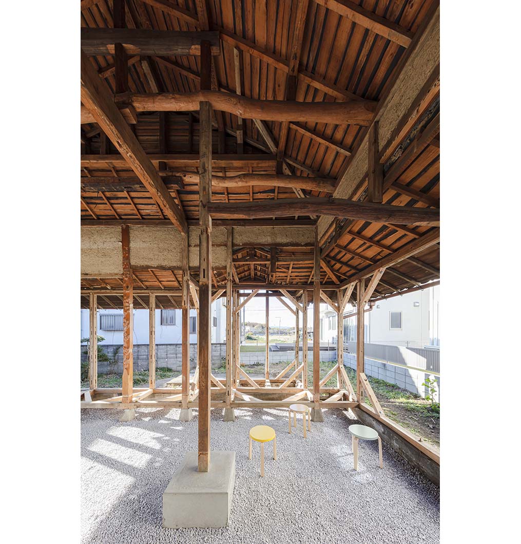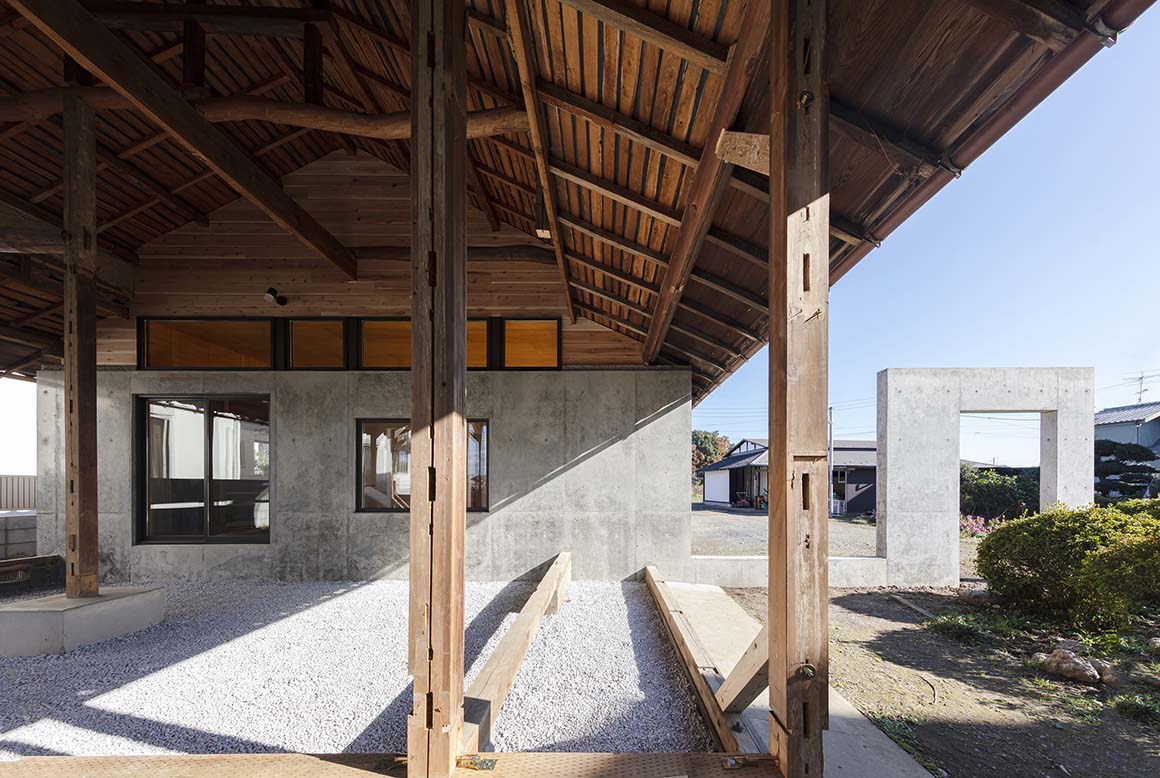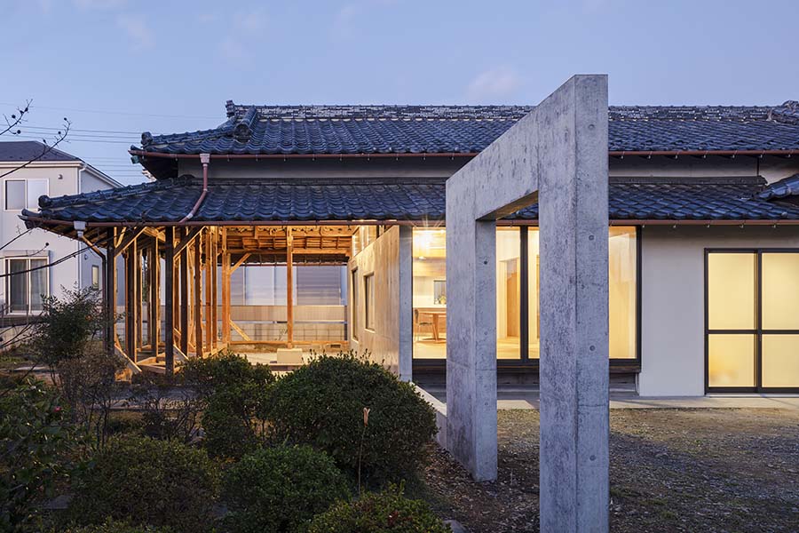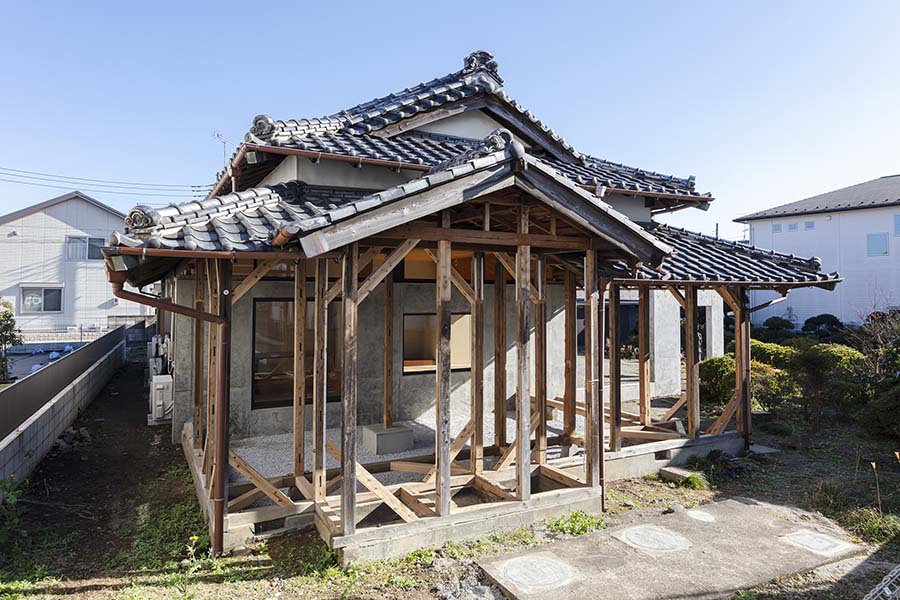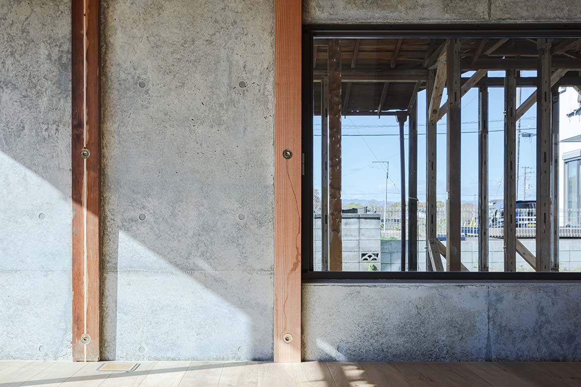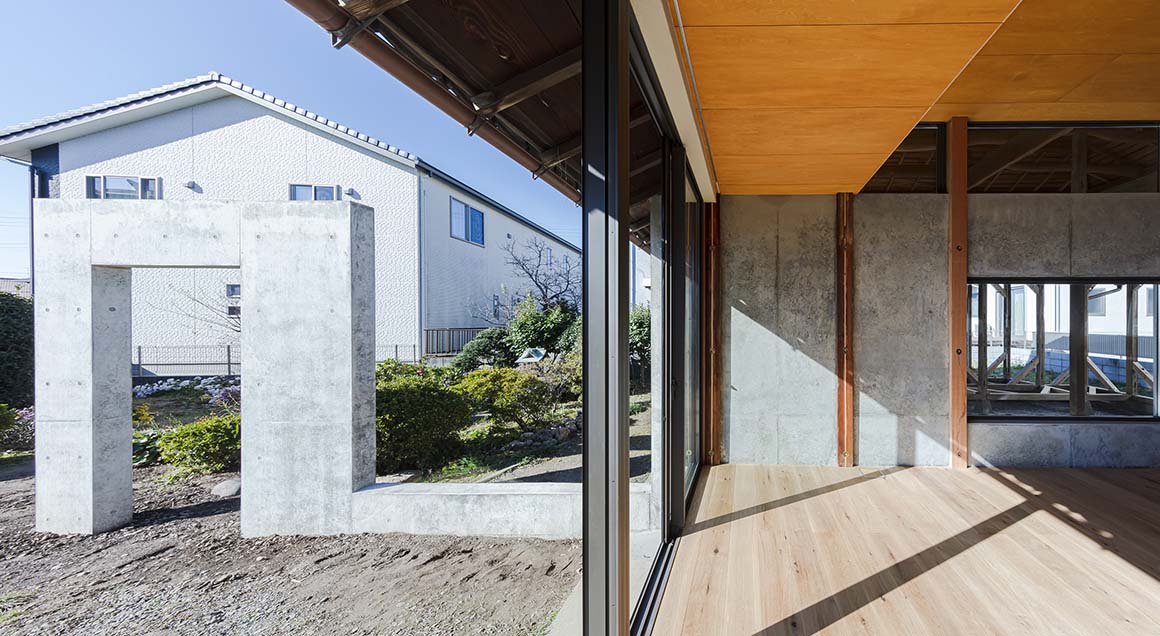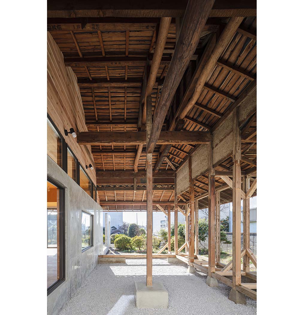 Reinforced concrete walls were used at the boundary between the pebble garden and the interior space. This reinforced concrete wall extends from the house and also serves as the gate of the shrine on the site. The concrete wall is installed to a level that does not quite reach the wooden roof beams; it swallows the existing wooden pillars, showcasing them while tightening them to make shorter columns, and performing seismic reinforcement; it creates a texture that evokes a new life.