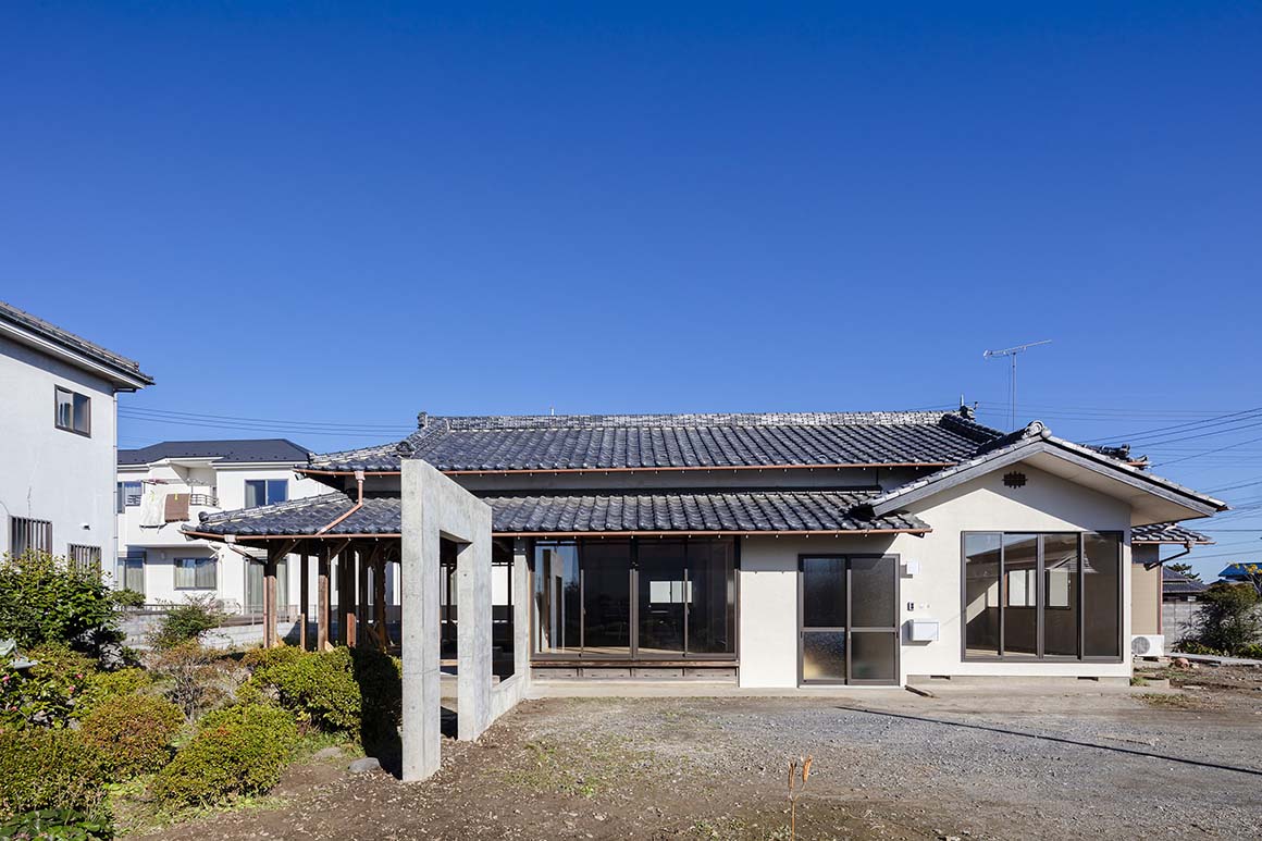 The Japanese roof tiles of this house were in good condition, and the designers felt that the character of these tiles was effective on the gable-ends of the residence. As a result of retaining this original feature, a semi-outdoor space was created, and by applying gravel to the inside of the foundations here, the area becomes a rock garden with an unusual texture.