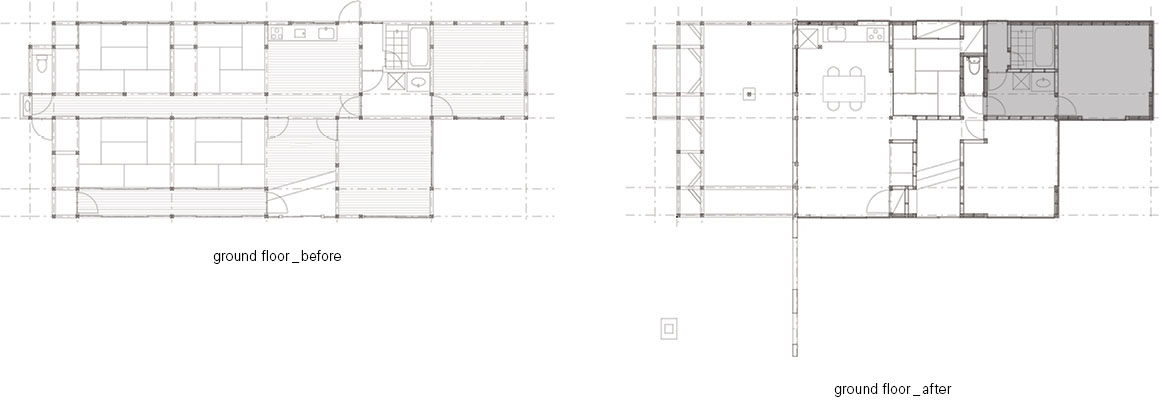 Closer inspection during the building survey revealed that the existing main house had no seismic resistance and only the eastern extension was braced, so the overall seismic balance was poor. Therefore, the architects decided to dismantle the west side of the building, about a quarter of the whole property, leaving behind only the framework and roof.