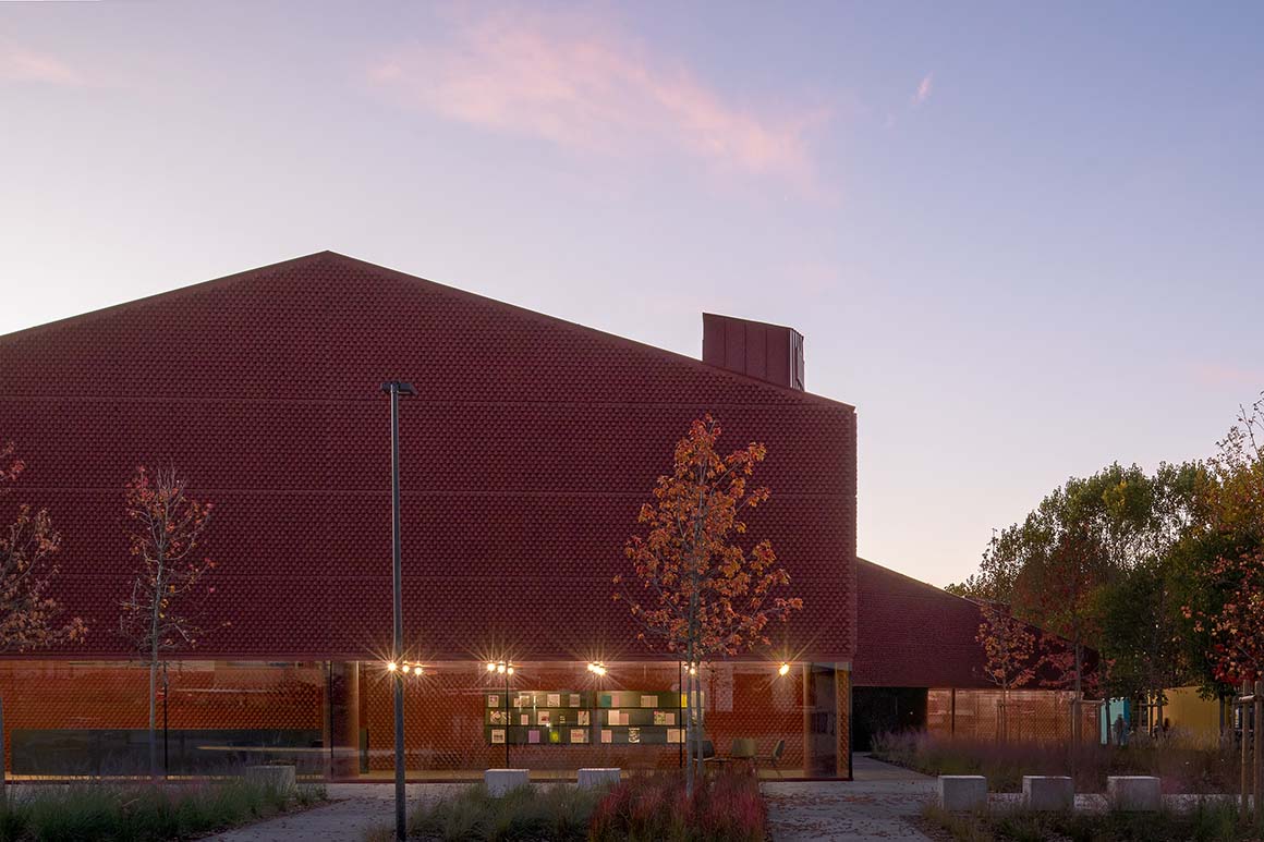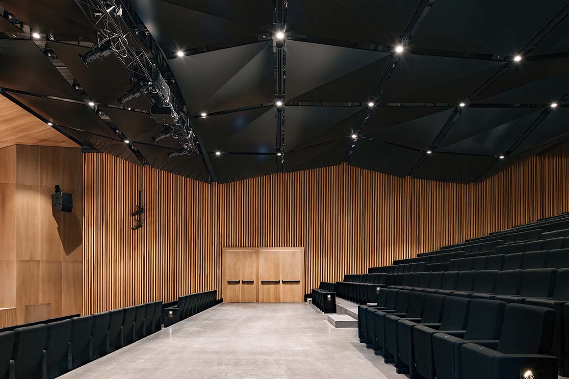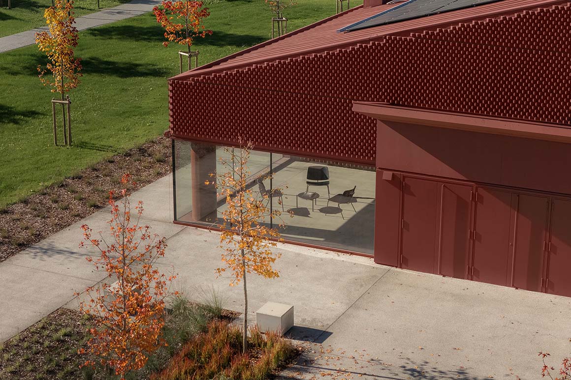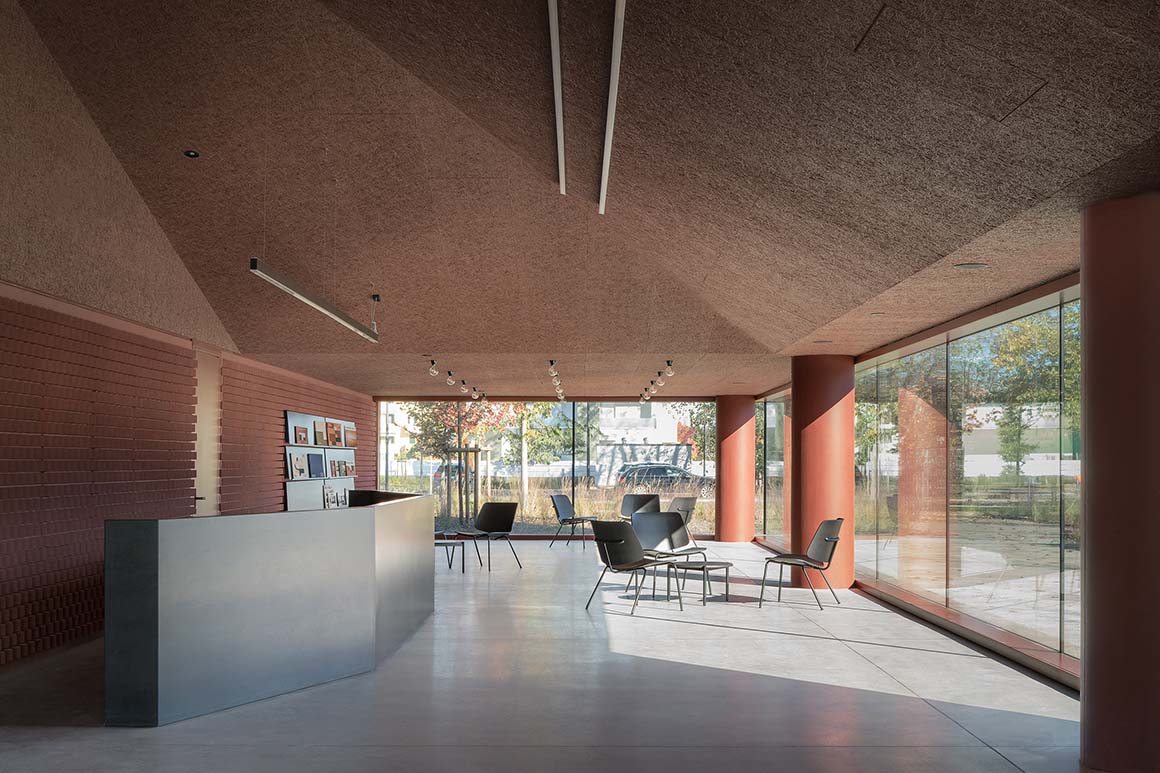 Beneath its gabled roof, the single monolithic volume reinterprets the region’s traditional rural farmhouses in a contemporary language. The texture of historic brick construction is translated into a modern cladding system, giving the building a strong and distinct identity. This approach mediates between the surrounding landscape and the adjacent urban fabric while narrating the site’s temporal layers through a contemporary architectural expression. Positioned at the threshold between town and countryside, the building engages its context through scale and materiality, achieving a refined balance between interior and exterior. Large openings frame outward views, reinforcing visual continuity with the neighboring park. The entrance sequence unfolds through alternating compression and expansion, gradually heightening the visitor’s perception. Upon reaching the main hall, the full scale of the performance space is revealed at once, creating a dramatic spatial climax. The auditorium is equipped with a precisely engineered acoustic system and a flexible stage configuration capable of accommodating diverse performing arts programs. Interior walls are articulated in wood, generating a rhythmic three-dimensional expression that establishes a modern yet warm atmosphere.