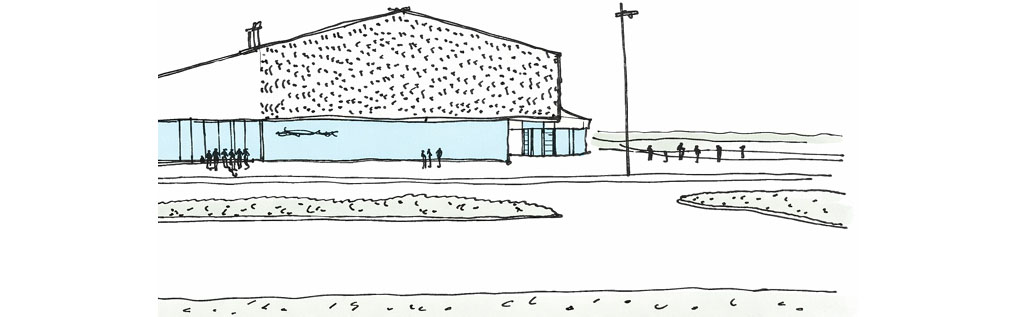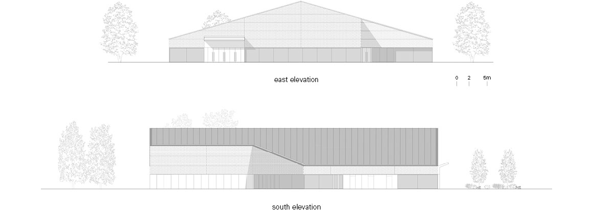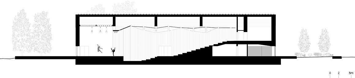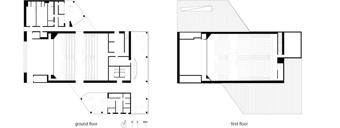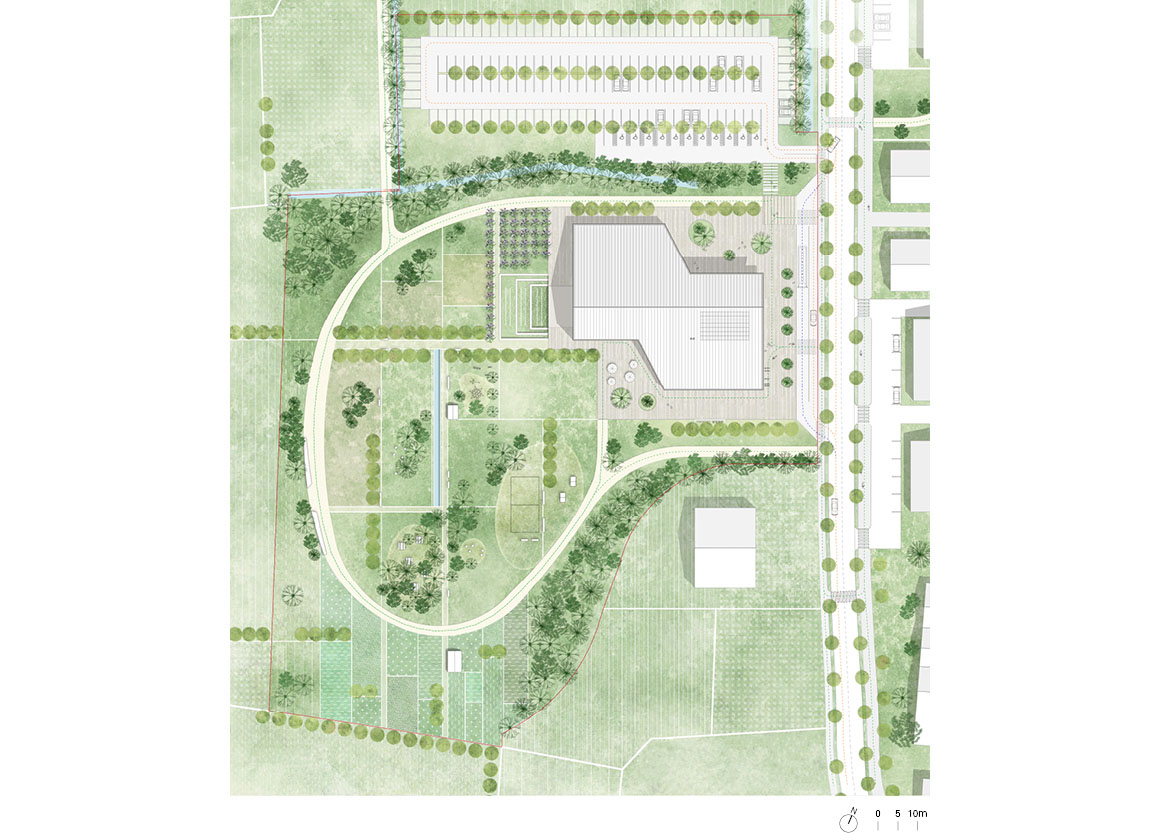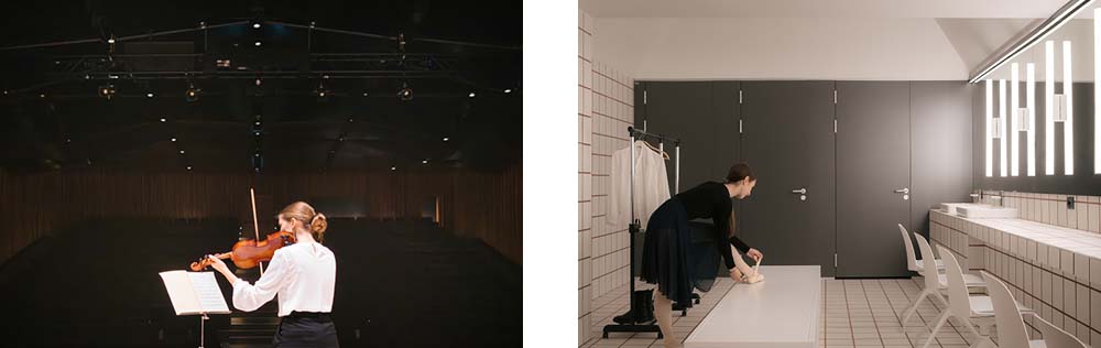 Beneath its gabled roof, the single monolithic volume reinterprets the region’s traditional rural farmhouses in a contemporary language. The texture of historic brick construction is translated into a modern cladding system, giving the building a strong and distinct identity. This approach mediates between the surrounding landscape and the adjacent urban fabric while narrating the site’s temporal layers through a contemporary architectural expression. Positioned at the threshold between town and countryside, the building engages its context through scale and materiality, achieving a refined balance between interior and exterior. Large openings frame outward views, reinforcing visual continuity with the neighboring park. The entrance sequence unfolds through alternating compression and expansion, gradually heightening the visitor’s perception. Upon reaching the main hall, the full scale of the performance space is revealed at once, creating a dramatic spatial climax. The auditorium is equipped with a precisely engineered acoustic system and a flexible stage configuration capable of accommodating diverse performing arts programs. Interior walls are articulated in wood, generating a rhythmic three-dimensional expression that establishes a modern yet warm atmosphere.