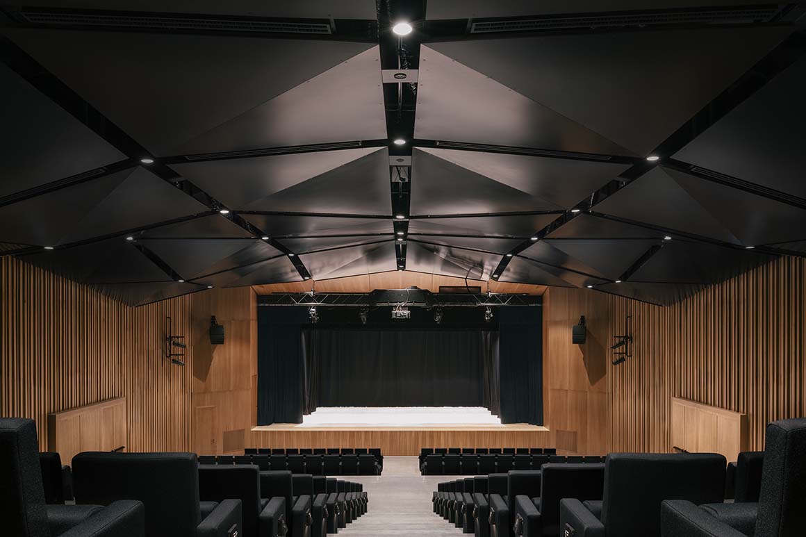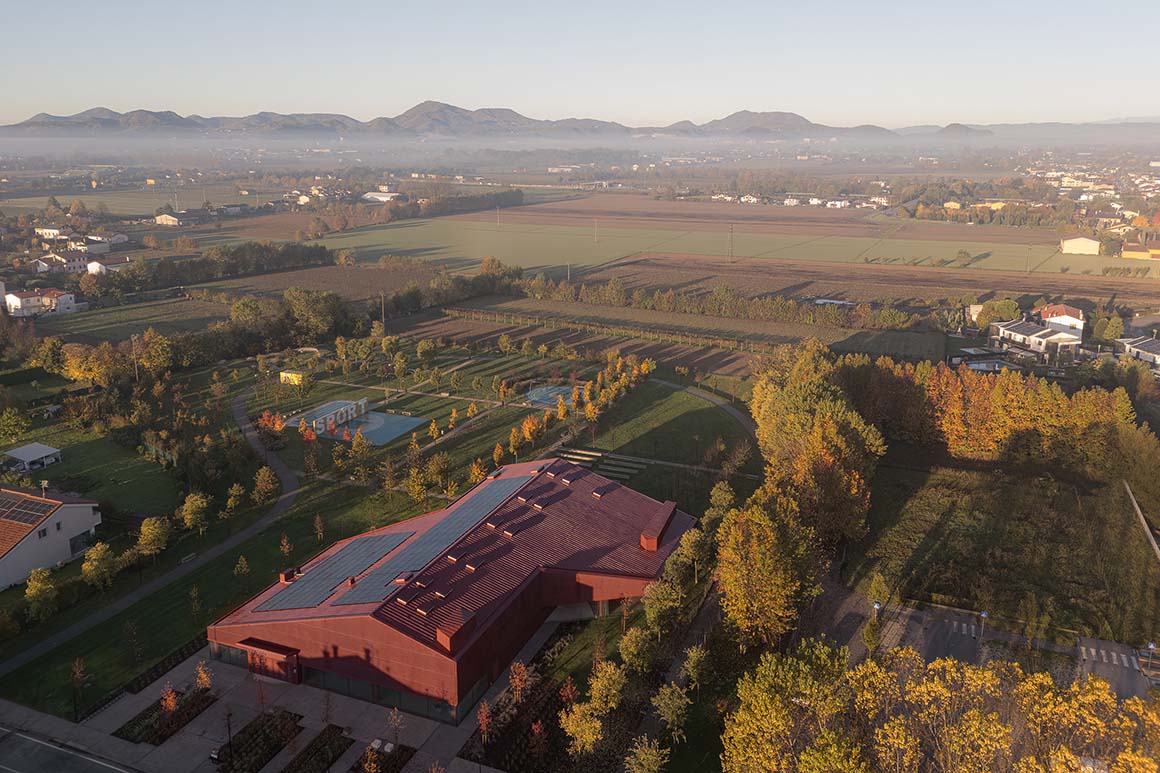 Project: Albignasego Auditorium Theater / Location: Albignasego, Padova, Italy / Architect: MD41 (Fabrizio Michielon, Sergio de Gioia) / Project team: Andrea Tommasin – arch. Alessandro Michielli / Structural engineer: Origine Ingegneria srl / MEP engineer: Mountech Srl / Landscape architect: POOL landscape / Acoustic design: Studio Architetto Eleonora Strada / Contractor: Mu.bre / MEP contractor: SICE / Collaborators: Serramenti Piovanello, Novoferm, Mazzonetto, Tekno coop, Rivo Interior, Celenit, Esse-ci, Decima, Cinearredo, Poloniato, Tesi System, Specchi Iva, True Design, Bonello pubblicità, Zanette Srl / Client: Municipality of Albignasego / Use: theater / Site area: 19,000m² / Gross floor area: 1,500m² / Completion: 2025 / Photograph: ©Tobias Kaser (courtesy of the architect); ©Alessandra Bello (courtesy of the architect)