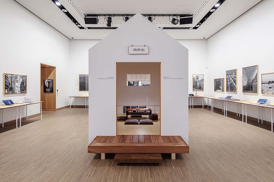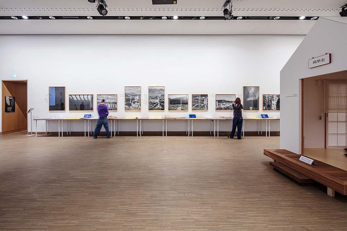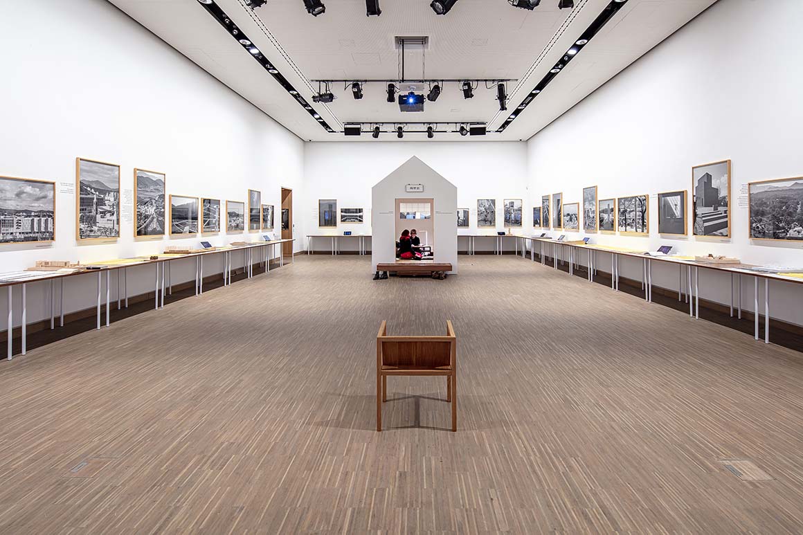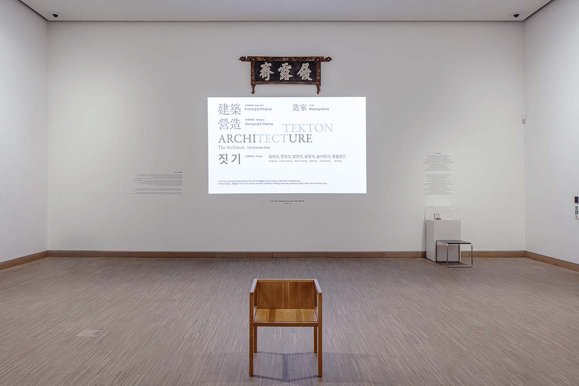 The Architecture and Words show had four spatial parts: a wall for projections, as mentioned; the 16 projects around three walls, with models, drawings, photos and descriptions on table-mounted wooden panels; an open space with a single chair of Seung’s design, and a small white installation enclosing a ‘moonbang’ (traditional Korean scholar’s room).