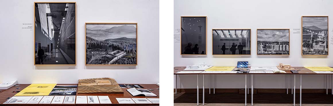 Seung was Seoul’s first City Architect (2014-16), and has taught and been honored with awards, both nationally and abroad. He could be described as a ‘Christian Brutalist Revivalist’, not just because he can design something like the ‘Dolmaru Catholic Church’ (1995) in Dangjin, the ‘Muhakro Methodist Church in Hayang’ (2018/C3#403) or others that stand with the very best of the typology when concrete and natural light are prime materials. Examples of Christian-related work recurred in the Vienna show, such as the major four-story concrete block of the ‘Retreat Center for Order of St. Benedict Waegwan Abbey’ (2024/C3#436) and ‘Myungrye Sacred Hill’ (2018/C3#422), a complex including a convent and a restored 1938 church on a hilltop site considered holy. Even the bamboo tower for birds, ‘Bugye Arboretum Sayuwon Birds’ Monastery’ (2013/C3#411), called ‘Josa’, has a chapel within it. Moreover, Seung describes himself as “a good Christian” and the show’s starting point were the words ‘in the beginning was the word’, from the Gospel according to St. John. Another projected slide referred to the architect as ‘creator god’, chiming with the word ‘tekton’ that is the root of ‘architect’ as well as the Greek description of Jesus as a maker. (Kazimir Malevich called his architectural conceptual models ‘arkhitektons).