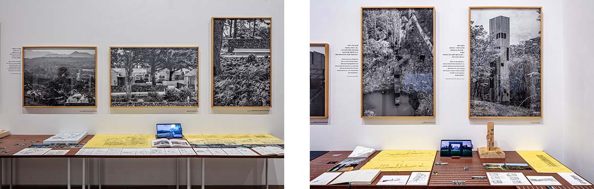 Of course, there is much secular work in Seung’s output, as was seen in the exhibition. Examples include a magical house embedded in Seoul’s urban fabric, ‘Aquarius Pyramid’ (2021/C3#418) and the ‘President Roh Moo-hyun Graveyard and Memorial’ (2010/C3#422, 2022) which integrates into Roh’s home village and the landscape itself as ‘sentimental topography’. There are several projects away from the cities, such as those in the Bugye Arboretum ‘Sayuwon’ (2013-2024/C3#411) situated between mountains north of Daegu. Key to Seung’s design is a response to ‘landscript’, a word he coined that addresses the accumulated past embedded in the land. A sense of tranquility, peace and contemplation weaves disparate projects together, from the city to remote locations shaped by nature.