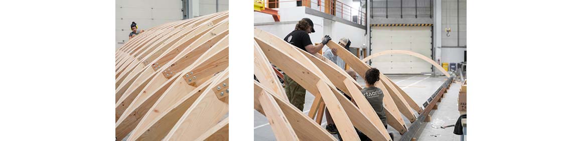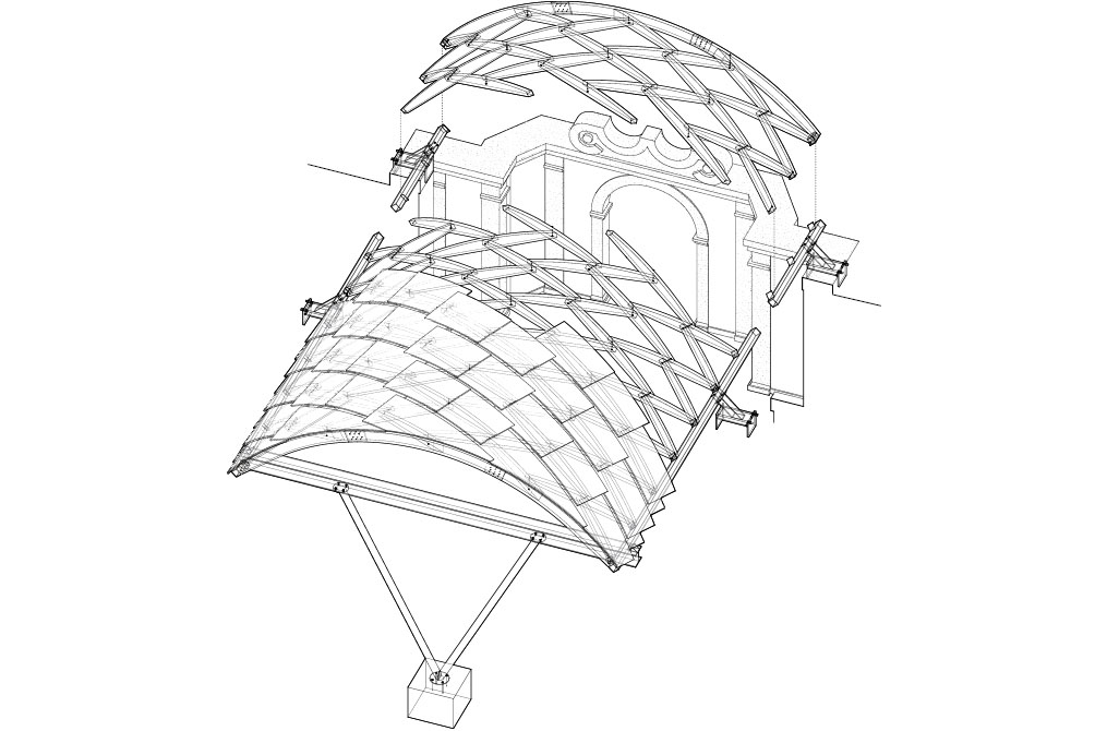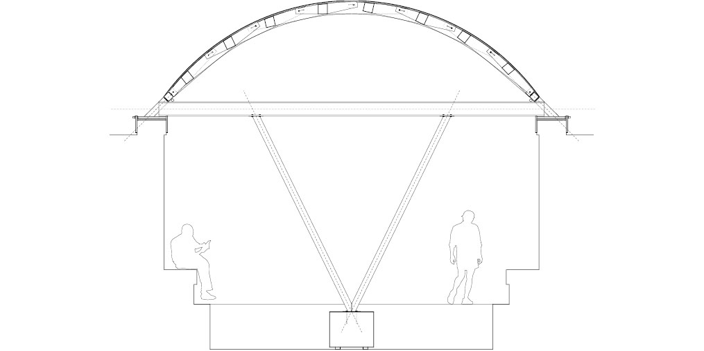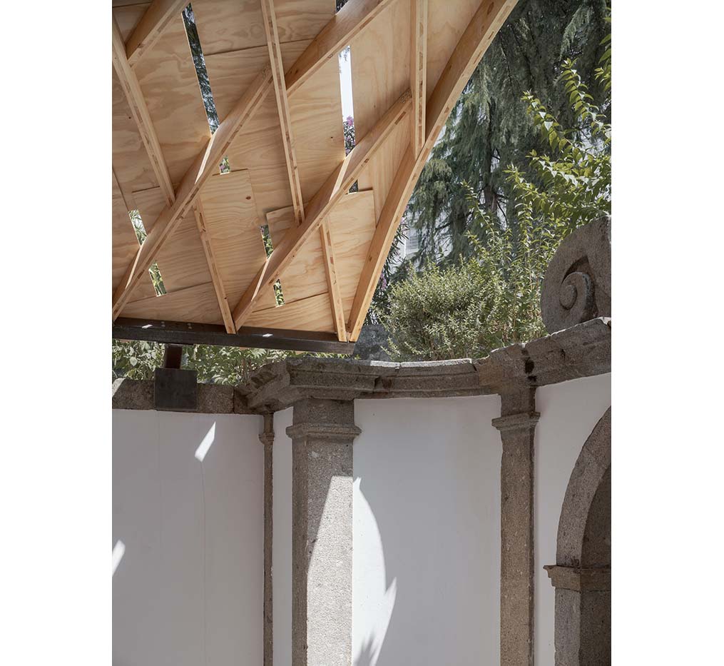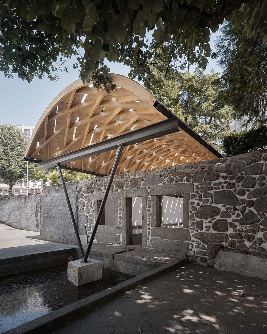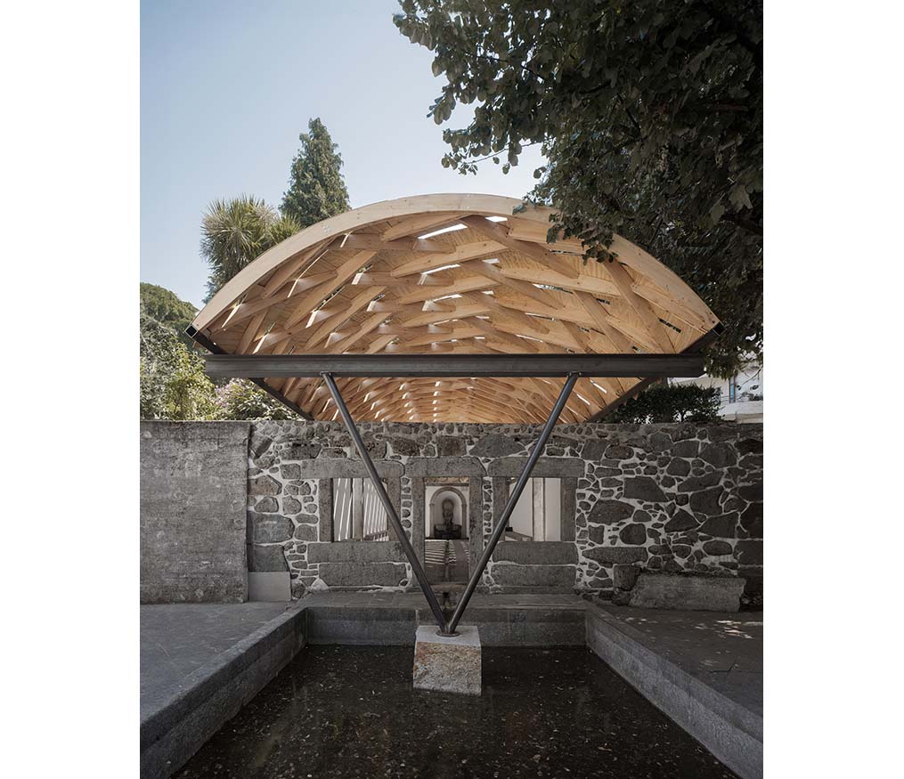 The roof, composed of repeatedly assembled rhombus-shaped timber elements, is characterized by its lightness and self-supporting structure. Plywood panels are added to form a curved surface, with gaps between them allowing light to pass through. Beneath the roof, a subframe of recycled steel sits, transferring loads to the existing stone walls. This configuration also echoes the flow of water from the fountain to the basin, structurally reinterpreting the context of the site.