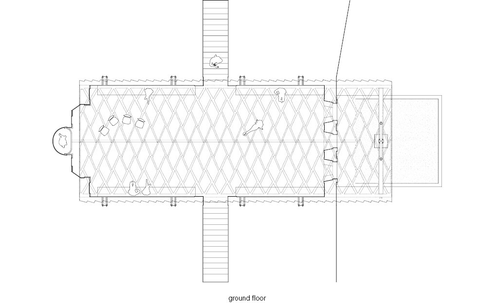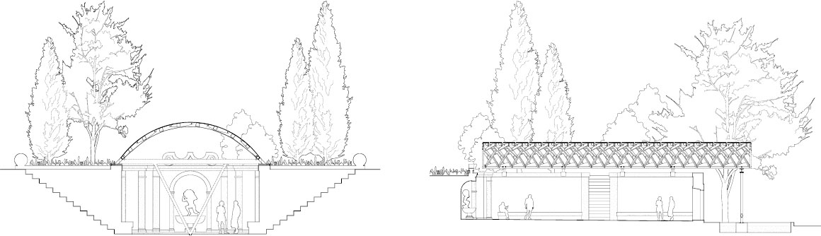 The remodeling approach is simple: the existing stone walls are repaired and restored, and a lightweight timber roof is introduced above. The remaining structures, instead of being demolished, are reinterpreted as retaining walls that stabilize the ground and form the basis of the space. A wooden arch, 6m-wide and 18m-long, extends above the main entrance, creating a shaded area that accommodates a range of activities. Like Atlas bearing the weight of the sky, the structure placed upon the ruins draws renewed attention to a once-overlooked site.