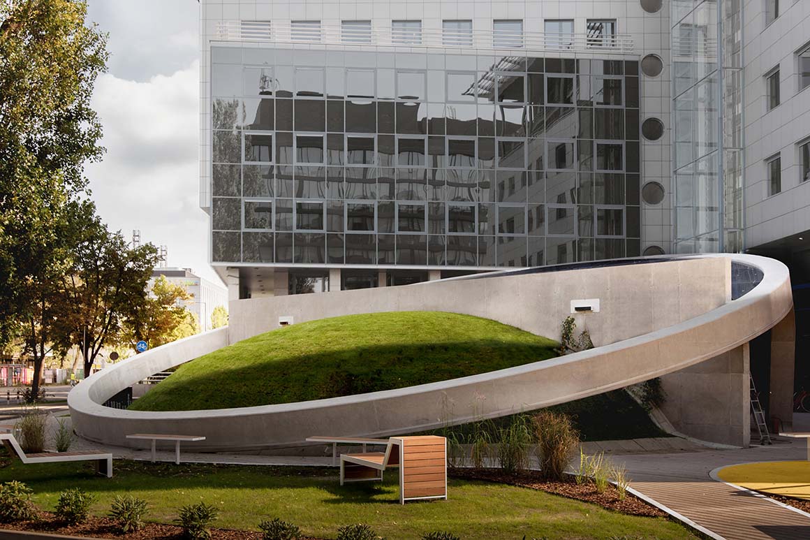 The square around the BEA was rejuvenated with new stone pavers, flowing forms of green spaces, benches, and playgrounds. The project was built from scratch on the grounds belonging to the Adgar BIT building, in which the Brain Embassy is located.