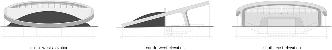 The overall concept of the BEA is a concrete circle consisting of an orchestra space and seating beneath a glass velarium which is supported by a reinforced concrete wall. The glass velarium contains no mullions, and is held together by stainless steel spider fittings. The most expressive form in the design is a monumental concrete ring encircling both landscaped berm at its base, and tilted up to support the glass velarium. The angle of the concrete ring was purposefully chosen to allow for a seamless transition of the landscape into the auditorium.