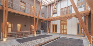 The Swedish architecture firm Norell/Rodhe has created a dynamic meeting place between Oostmeers and Westmeers. The term ‘meers’ in the local names means ‘marsh,’ indicating that the area was originally a marshland, now surrounded by urban areas with brick buildings from the 1970s. They’ve used recycled wood to frame, installed plywood walls to guide natural pathways, and created a garden inside, providing a comfortable environment for people to rest. New York based architecture and design firm SO-IL has created a fabric pathway structure in the courtyard of the Capuchin monastery. The once hidden courtyard of the monastery becomes a place of exploration, reconnecting with the streets of Bruges. The fabric used is made using techniques passed down by Bruges women through generations, and enhanced with modern 3D technology to intersect the past, present, and future.