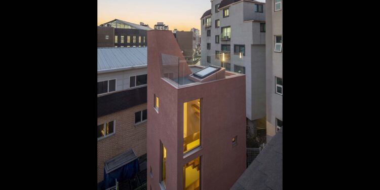 A small castle amid jammed neighborhood 100A associates Each floor is barely over 10m² in size. The small space is densely stacked on four floors. The building is walled with rough texture....