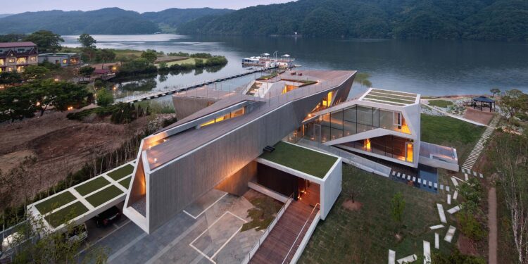 Cantilevers interact with the neighboring river IDMM Architects Guesthouse Rivendell is located on a riverside plot near Bukhan River; the client commissioned the 1,000m² house for his mother.Riverside architecture is subjected to...