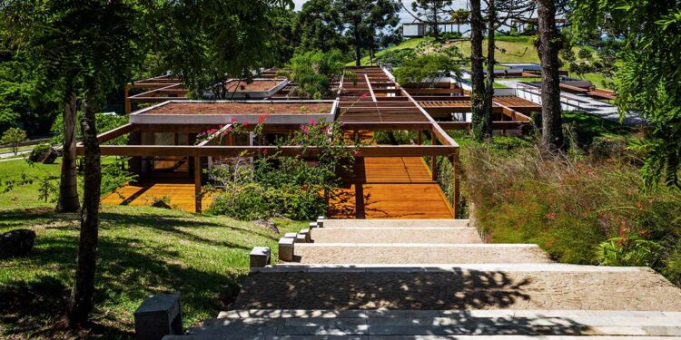 Wooden grid extending the valley hill FGMF Arquitetos Of the 532,400 m² of virgin forest greenery, only 65,000 m² are untouched. In a forest of boulders and araucaria trees on a sloping...