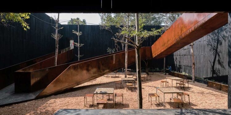A striking metal bridge connects the garden and the inner space of a Vietnamese restaurant 정원과 건물을 잇는 다리가 돋보이는 베트남 남부 달랏 시의 얌 레스토랑 Sawadeesign | 사와디이자인 At the new...