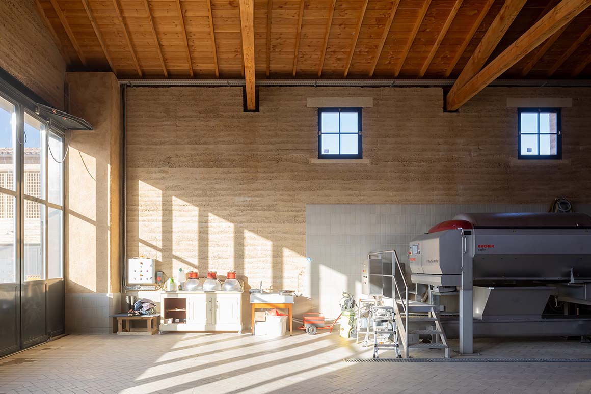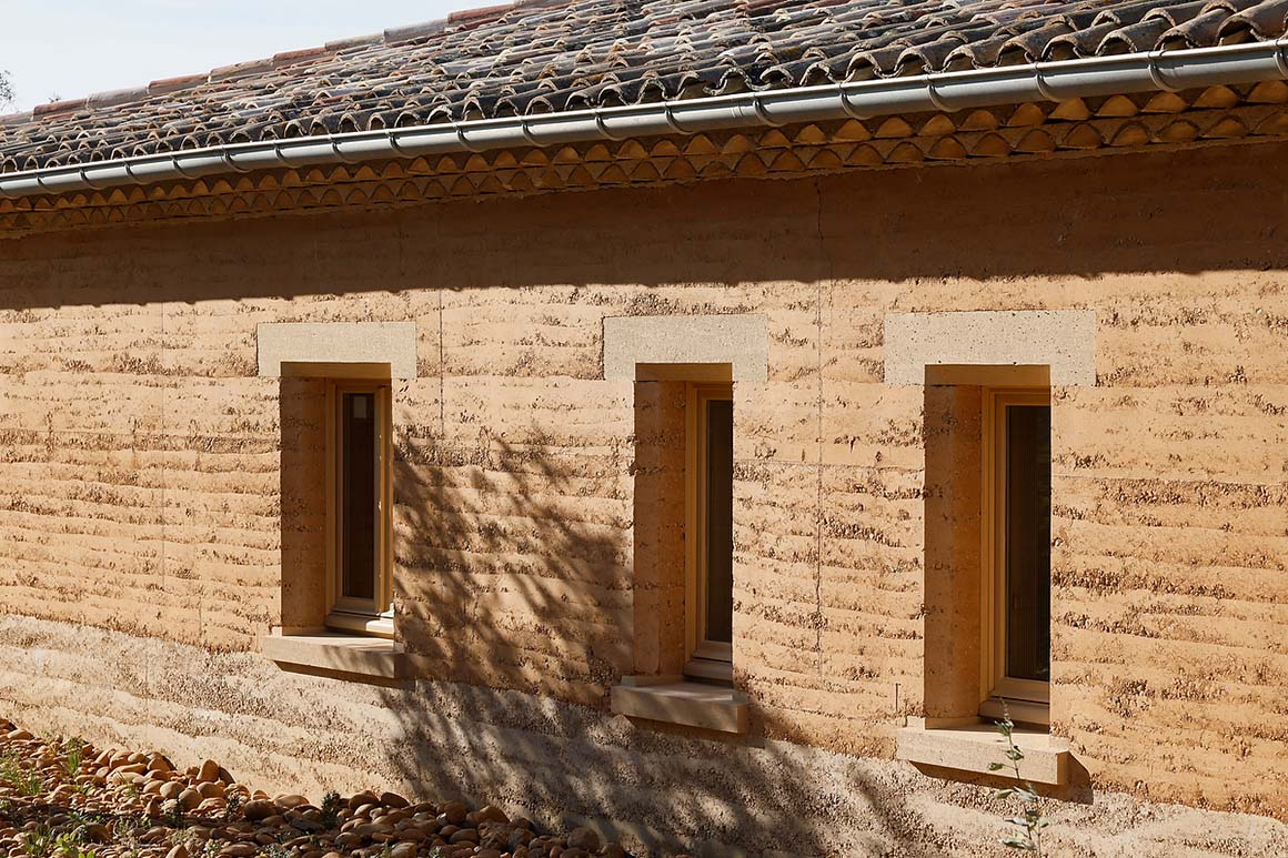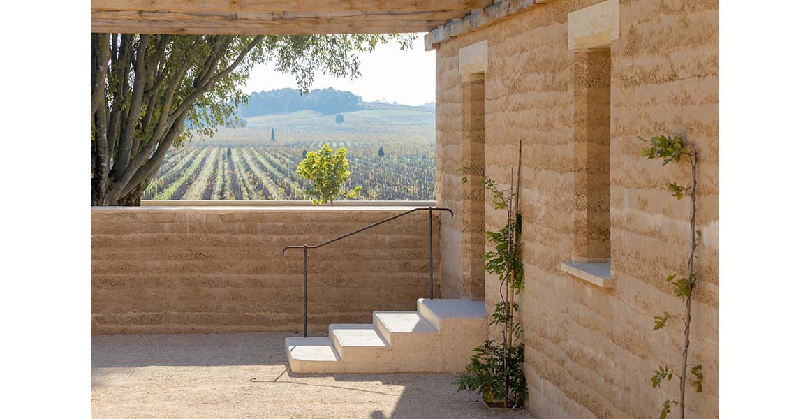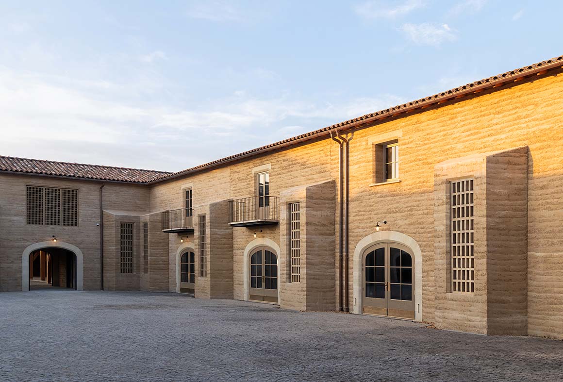 This respect for the land is embedded in the construction process itself, where excavated soil is transformed into the primary building material. Approximately 25,000m3 of clay and gravel, unearthed from a 60×40 meter site, were crushed and sorted to form the building’s structural backbone. The clay was used to create rammed earth walls for the main structures and enclosures, while sand and gravel were combined with recycled concrete debris from demolished buildings to produce a site-specific concrete unique to Beaucastel. Even the remaining soil was repurposed—mixed with lime and hemp to create finishing mortars and paints—echoing vernacular techniques long employed by local farmers.