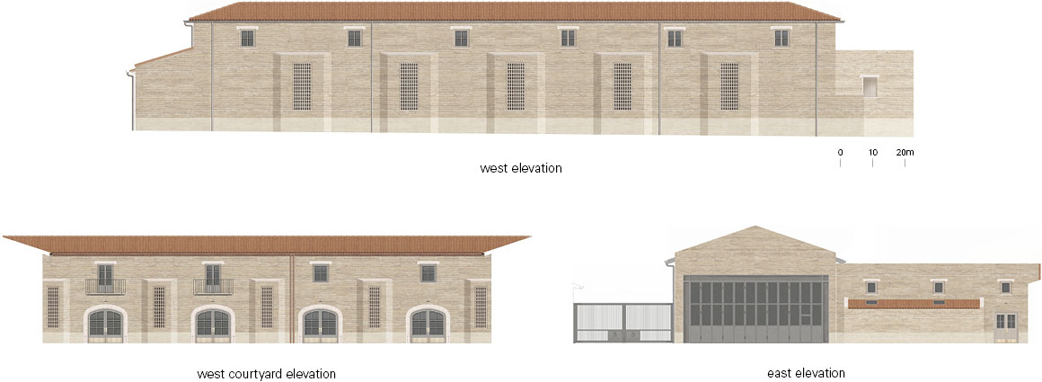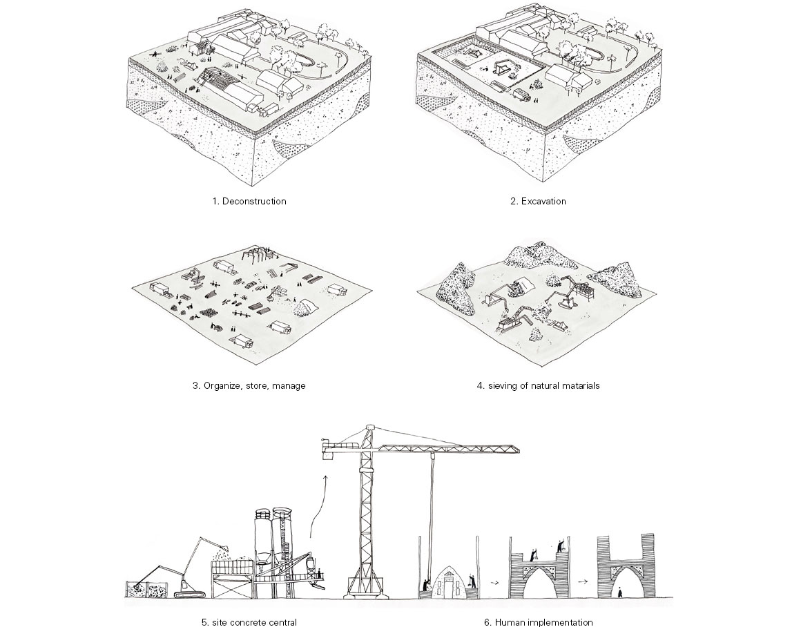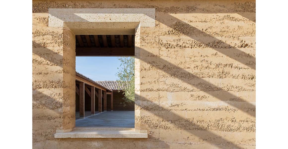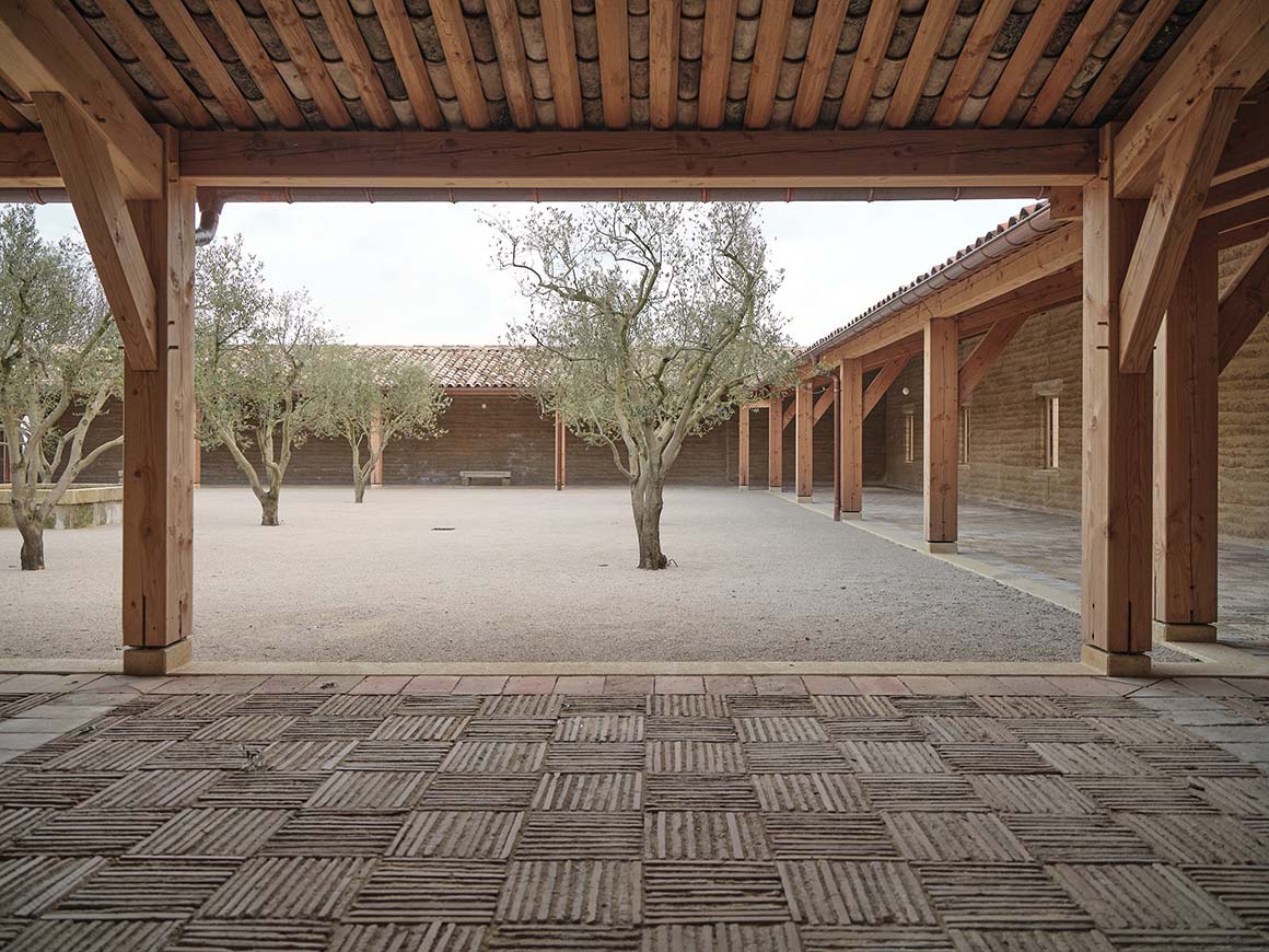 This respect for the land is embedded in the construction process itself, where excavated soil is transformed into the primary building material. Approximately 25,000m3 of clay and gravel, unearthed from a 60×40 meter site, were crushed and sorted to form the building’s structural backbone. The clay was used to create rammed earth walls for the main structures and enclosures, while sand and gravel were combined with recycled concrete debris from demolished buildings to produce a site-specific concrete unique to Beaucastel. Even the remaining soil was repurposed—mixed with lime and hemp to create finishing mortars and paints—echoing vernacular techniques long employed by local farmers.