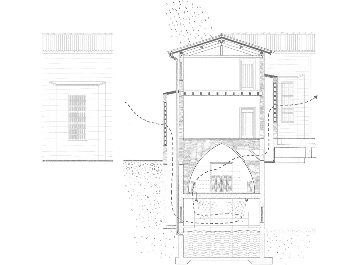 The subterranean spaces carved out during excavation form the heart of the winery’s terroir. Wine cellars and a vast rainwater reservoir are organically integrated beneath the surface. The reservoir not only supplies water for the winemaking process but also serves as a critical thermal regulator. As the Mistral—the fierce northwesterly wind characteristic of southern France—is drawn into the building through discrete air intakes, it cools as it passes through underground passages. The air then flows over the 14°C water reservoir and through a misting system, reducing its temperature by a further 5°C. Even at the height of summer, air cooled to approximately 15°C is delivered indoors. This passive system orchestrates wind, water, and temperature to maintain optimal conditions for wine maturation without reliance on external energy.