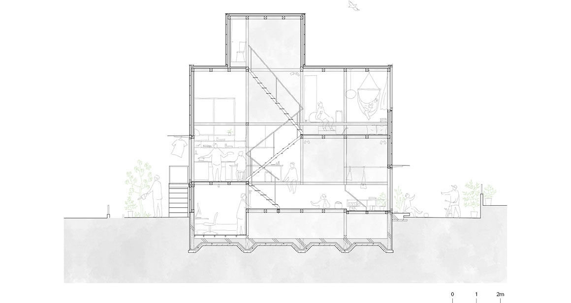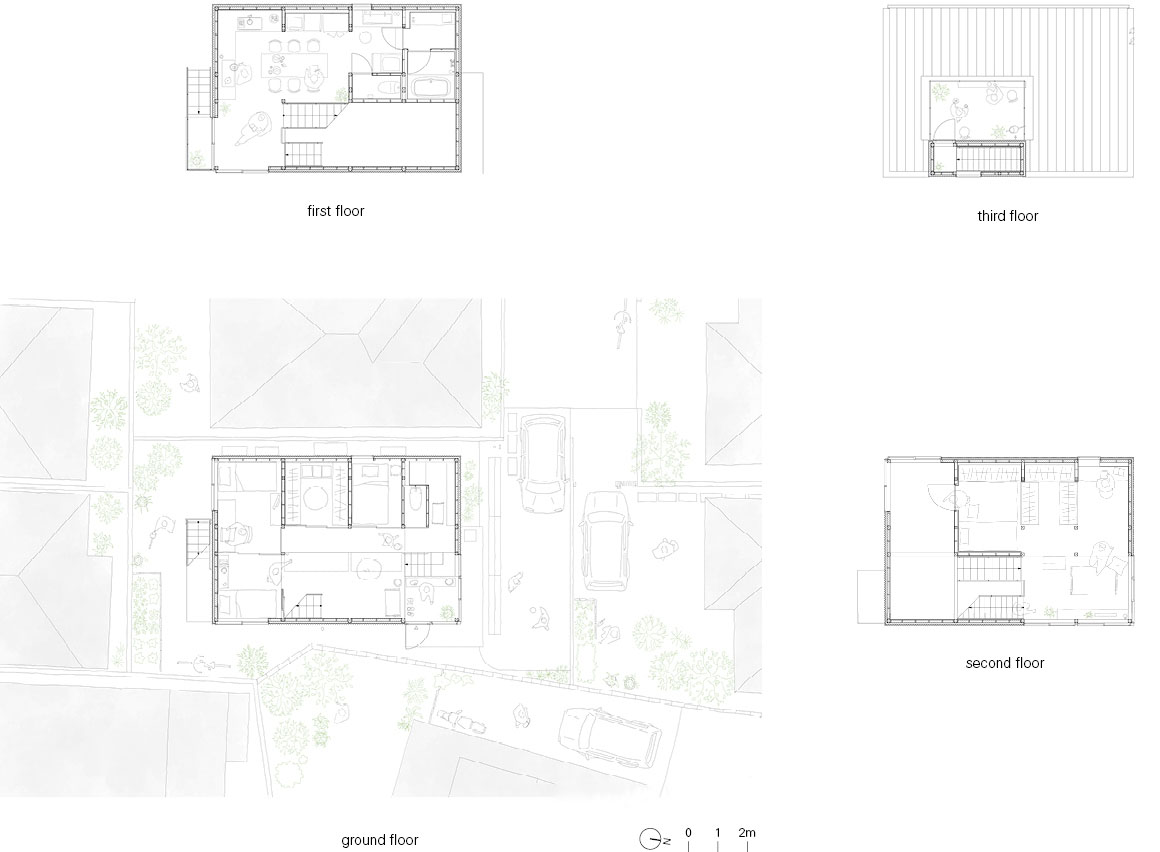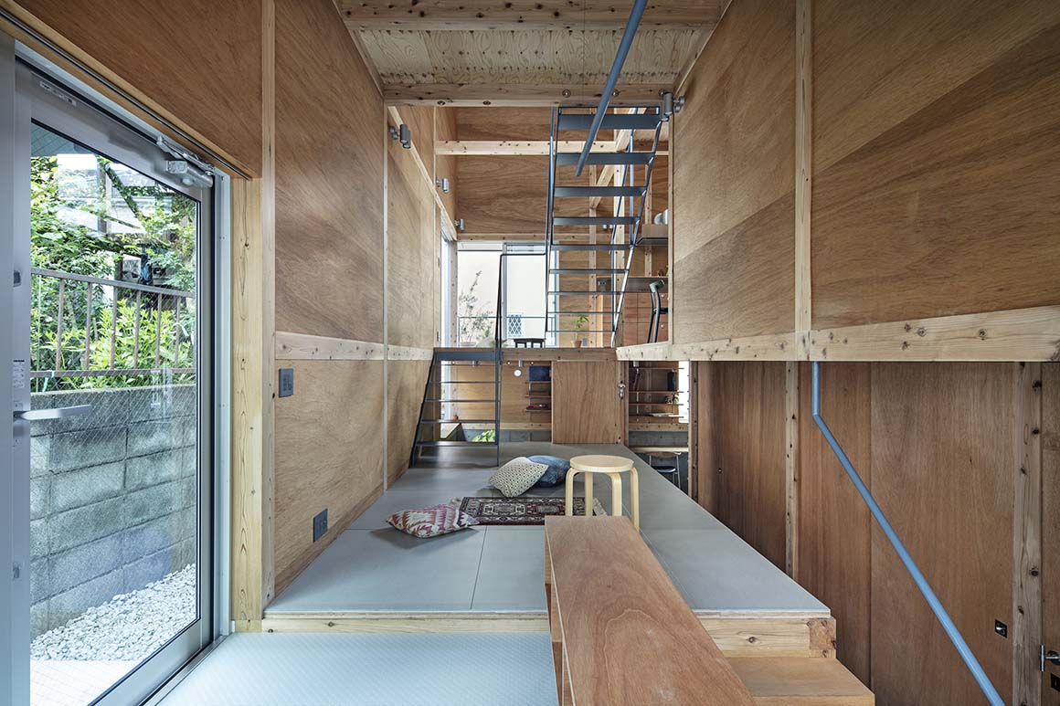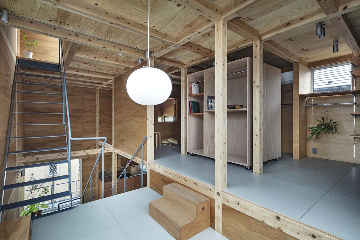 The house is organized on a grid system, but some columns are intentionally omitted and beams are staggered to enhance spatial continuity. Structural members, finishes, and furniture are all made of wood, creating a consistent atmosphere throughout. This emphasizes the organic flow of space while revealing the modular system that composes it. Across five levels, from the semi-basement to the rooftop, differences in floor height generate subtle variations in eye level, forming small pockets of space that encourage sitting or leaning, creating layered scenes of daily life. Gardens at the front and back soften the boundary with the neighborhood and foster a sense of familiarity. The first-floor balcony and large sliding doors open fully to the front garden, extending the house toward the street. The children move freely between indoors and outdoors with friends, and conversations with neighbors tending their gardens arise naturally. The second floor contains the dining area and household workspace. A large central table supports meals, study, housework, and remote work, allowing diverse daily rhythms to coexist. The semi-basement and third floor contain small rooms ranging from 4.5 to 7.3㎡. Sliding doors and movable furniture connect these rooms to one another and to shared spaces, enabling flexible control over openness and privacy. The house can adapt to changes in lifestyle and the passage of time.