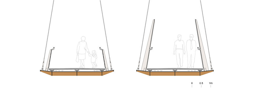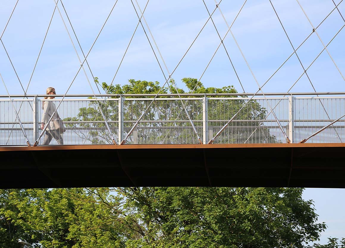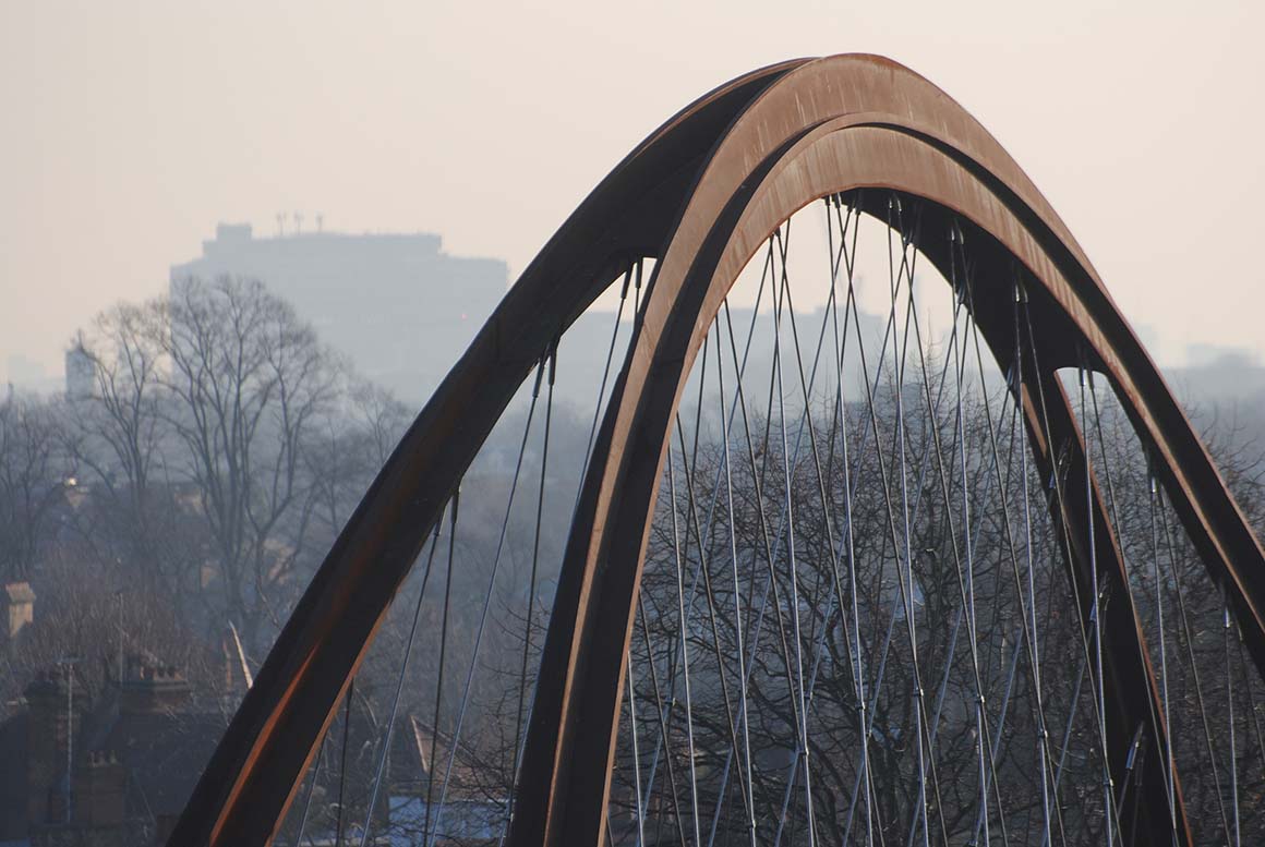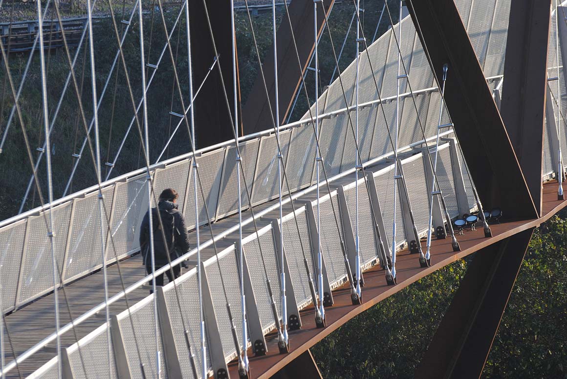 The network arch, an unusual development for footbridge design, is an efficient structural form. It solves the pedestrian dynamics and removes the need for dampers, allowing for the removal of substantial material from the arches. The crossing of the support cables provides additional restraint to the arches to aid in buckling resistance. The result is an extremely slender deck profile and an elegant tapering to the cross section of the arches. The bridge achieves long spans over varied terrain with minimum material use.