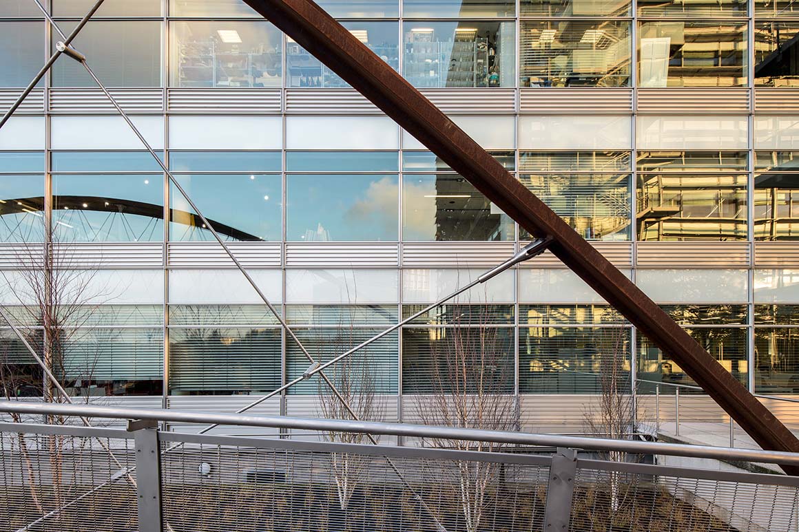 The tripartite plan allows the spans to gently curve, following the most efficient route between the landing points. These arches are formed from a cruciform section which continually changes in width and height according to where the material is needed for the optimum structural design. This rigor in collaborative design realizes a beautifully crisp arched silhouette, engineered and delivered through skilled fabrication.