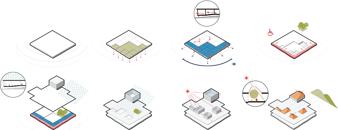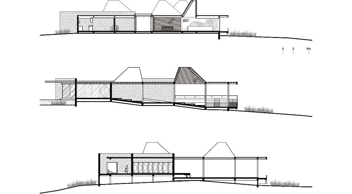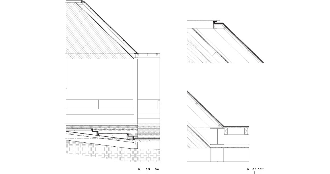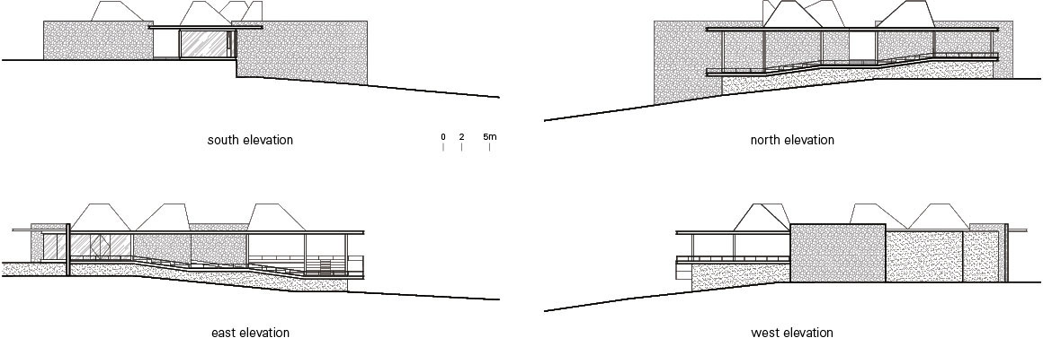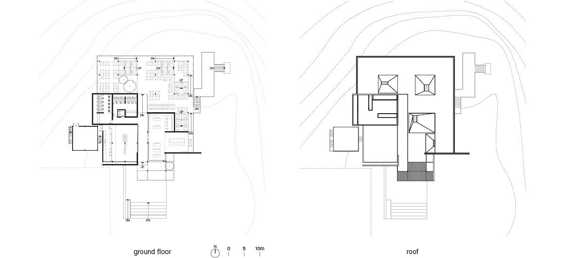 The main concept of the design is to provide visitors with a clear view over the plantation, and be close to the natural surroundings without inconveniencing elderly visitors and disabled people – it should be as accessible as possible. To widen the scenery across the slopes, the dining area is stepped to follow the contours of the land. This allows all customers from every table to see the view at different levels. Moreover, to protect the dining area from heavy rain, intermediary spaces with extended eaves cover the dining area, and under the eaves, a ramp which surrounds the dining area creates accessibility at all levels.