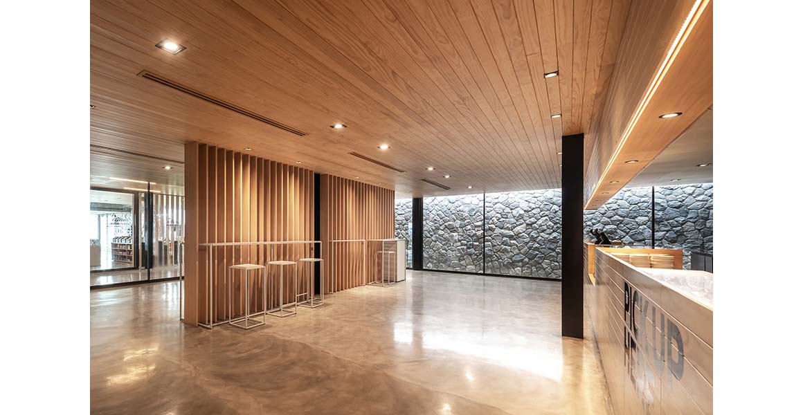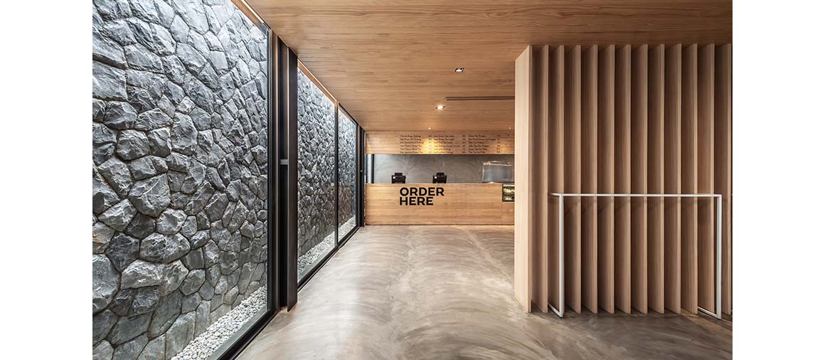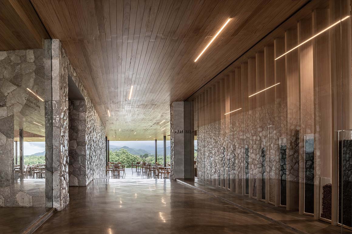 Along the stone wall at the entrance, visitors enter through only a small void, which acts as the wind tunnel that greets the visitors with a welcome breeze. As one moves through this tunnel, the dimly-lit atmosphere is gradually brightened until the dining area is reached, where visitors enjoy their food and the scenery. The materials of the project are harmonious with those of the first café, including pinewood, steel, glass and mountain stone. These materials represent Choui Fong’s philosophy of an organic plantation.