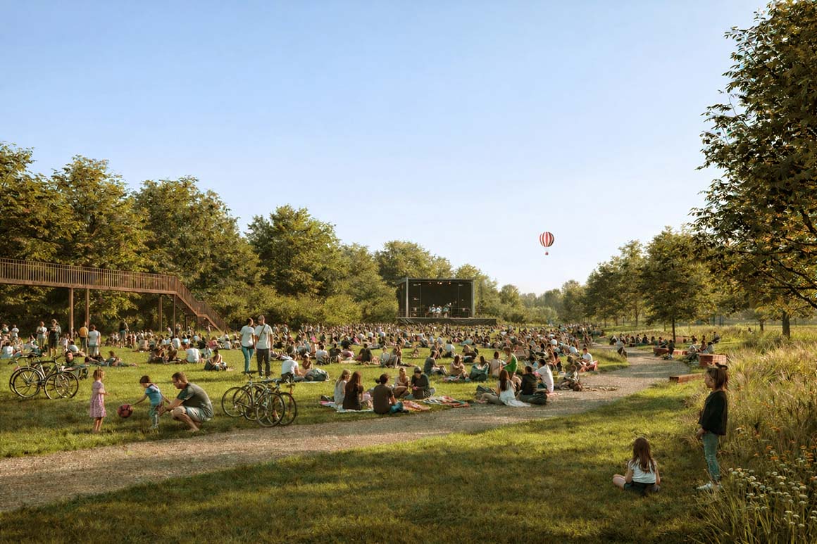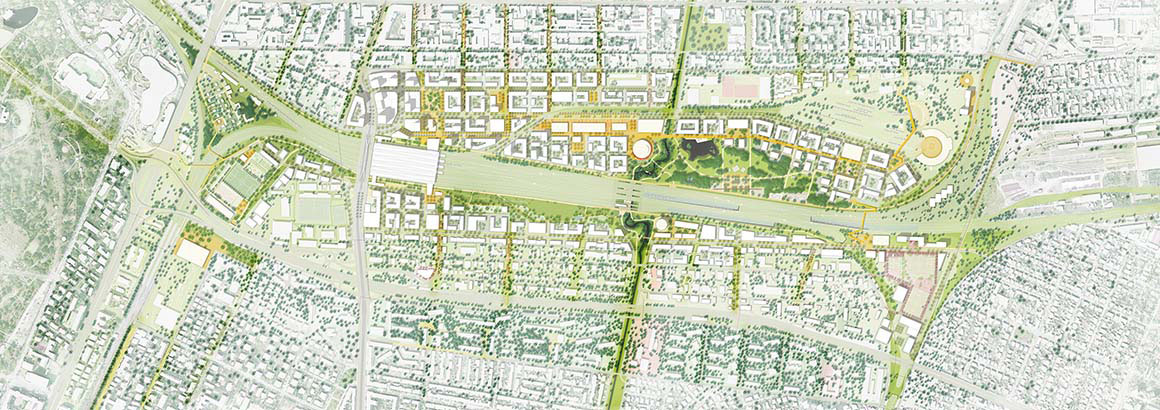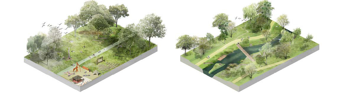 A new Railway Park will connect to the Forest Park across the railway, forming a major green corridor in northern Budapest. It will include meadows, event spaces, and a central lake. Beyond the Rákos Stream, fragmented landscapes will be reorganised into a sports and recreation zone with outdoor fields and facilities, along with an additional metro station. Existing railway buildings and depots will be repurposed into cultural facilities, including a municipal library and a railway museum. A continuous loop of public spaces will link neighbourhoods and cultural amenities, integrating the district into a coherent urban fabric.