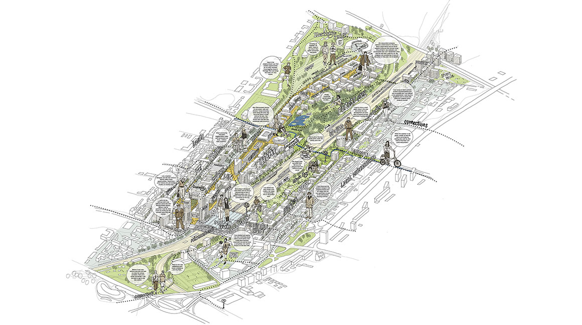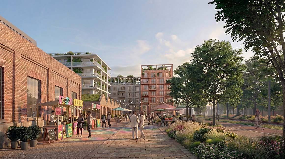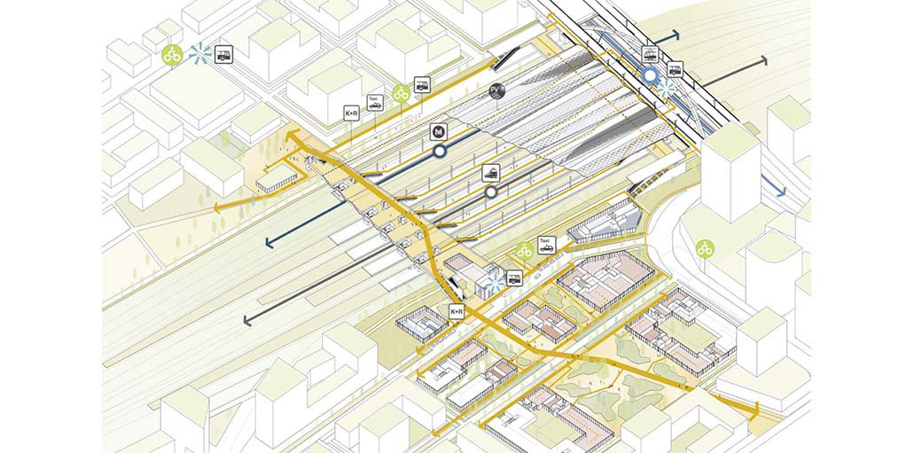 A new civic plaza in front of the station is designed as a year-round public space for markets, cultural events, and everyday activities, incorporating trees, water features, and shaded areas. It will establish a recognisable identity for the district while maintaining continuity with the existing landscape. The dense urban core gradually transitions into mid- and low-rise residential areas, supported by a continuous green network on both sides of the railway. With a strong emphasis on public transport, the plan reduces car dependency and enables pedestrian-oriented streets and public spaces.