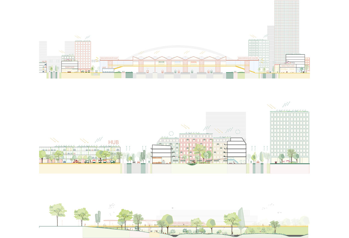 The winning proposal sets out a people-oriented urban framework that prioritises landscape and ecological continuity. The site is divided into six sub-districts, each with its own identity and anchored by a local centre that supports public life. This approach reinterprets the neighbourhood structure of Budapest’s historic inner city in a contemporary manner. The existing Rákosrendező railway station will be transformed into a multimodal hub serving as the central node of the development, connected to an extended metro line, a new tram line, and an active mobility network. The surrounding area will accommodate a high-density mix of offices, retail, hotels, and services. The station will also reconnect the currently divided eastern and western parts of the site, reinforcing its role within Budapest’s regional and long-distance transport network.
