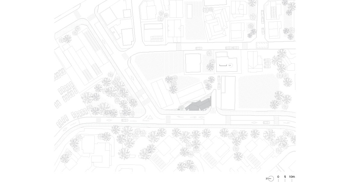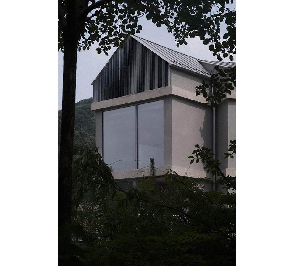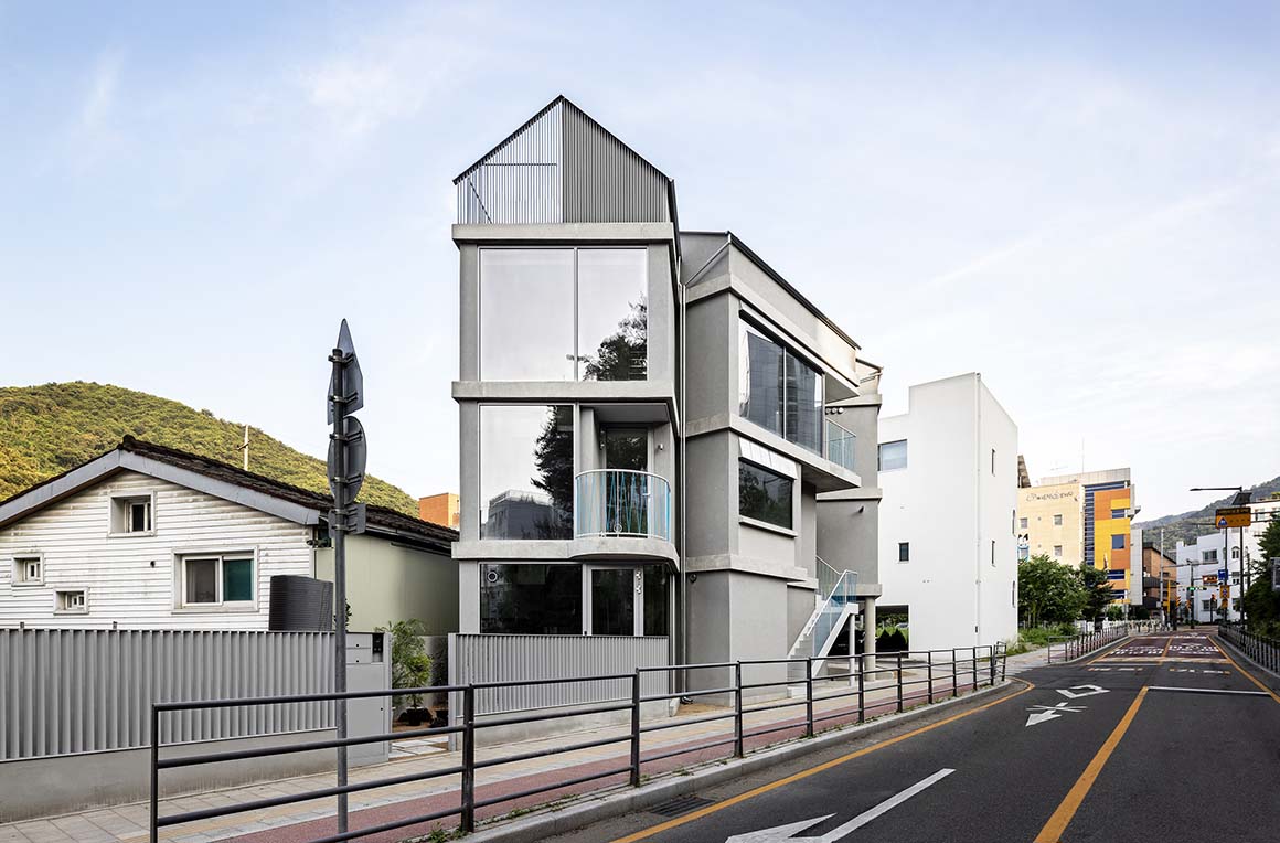 Between a natural landscape of mountains and streams, a scene where houses and vegetable gardens intermingle, and a setting where large apartment complexes and commercial buildings coexist, a small village has taken root. On a narrow, elongated triangular plot stands a small community of more than ten people: a large extended family spanning three generations, along with tenant households. Centered on the client, who is a daughter, a daughter-in-law, and a mother, the three-generation household consists of her spouse, her parents, her mother-in-law, and three children. Their way of life resembles a new form of community emerging in contemporary society. Joined by neighboring tenant households, the house was envisioned as both individual and social, both domestic and urban, forming a rich and layered landscape.