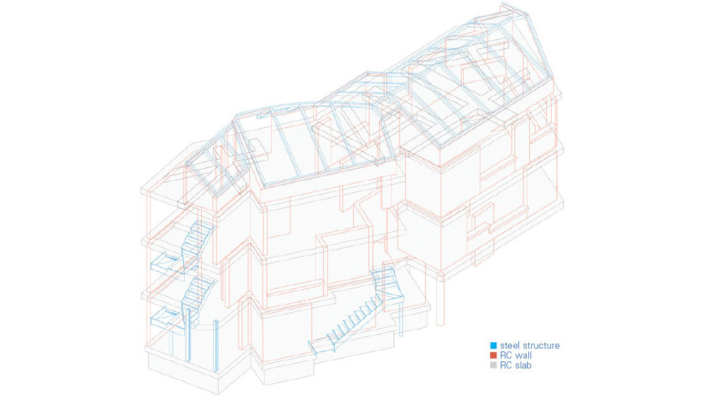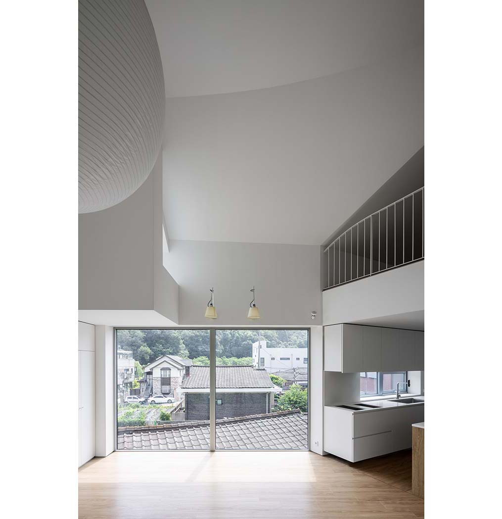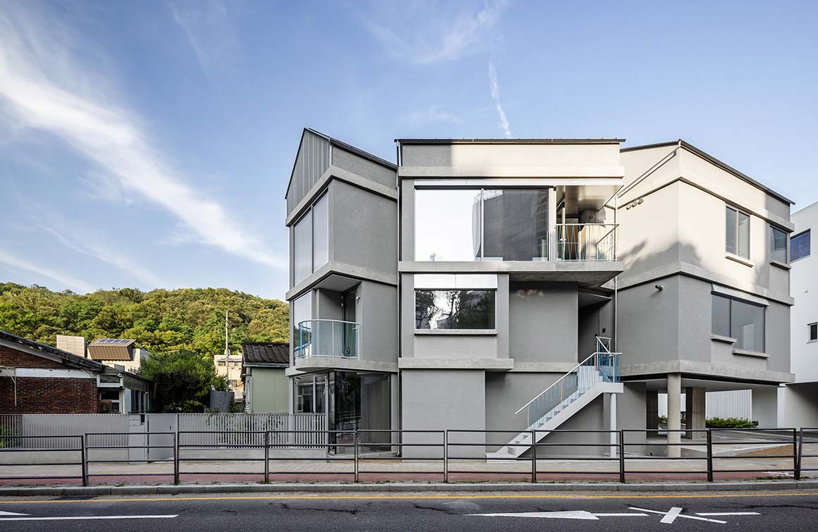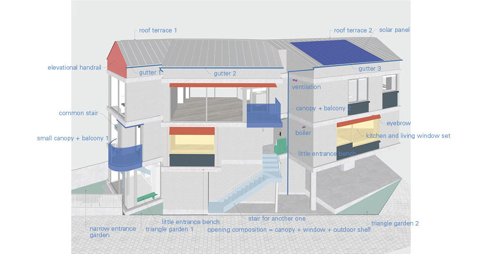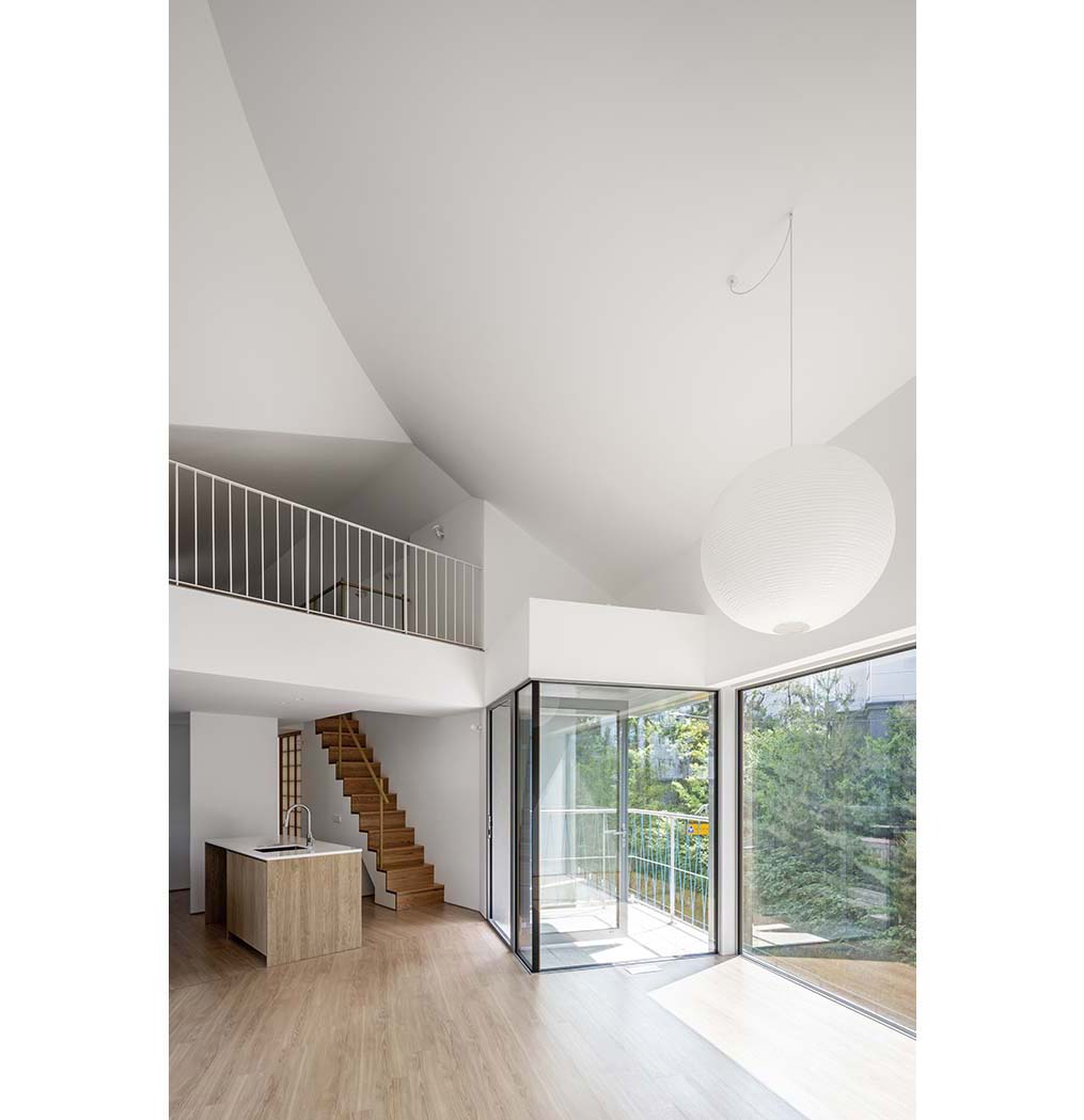 The Intuitive clarity of a form in which parts come together to make a whole—the image of multiple houses gathered—gives residents a spatially layered perception. It is not the feeling of dividing a single house, but a plural sense of individual houses connected to one another. Beneath the polygonal roof formed by overlapping and connected planes, the three houses appear less as a single, complete object than as a scene of neighboring houses standing side by side. This collective architecture—like a village, like a city—reimagines the public nature of the village that has disappeared from the modern city. Irregular, small orders, and individual lives gathered in loose clusters, once again sketch the beautiful everyday landscape of private houses opening outward into a village.