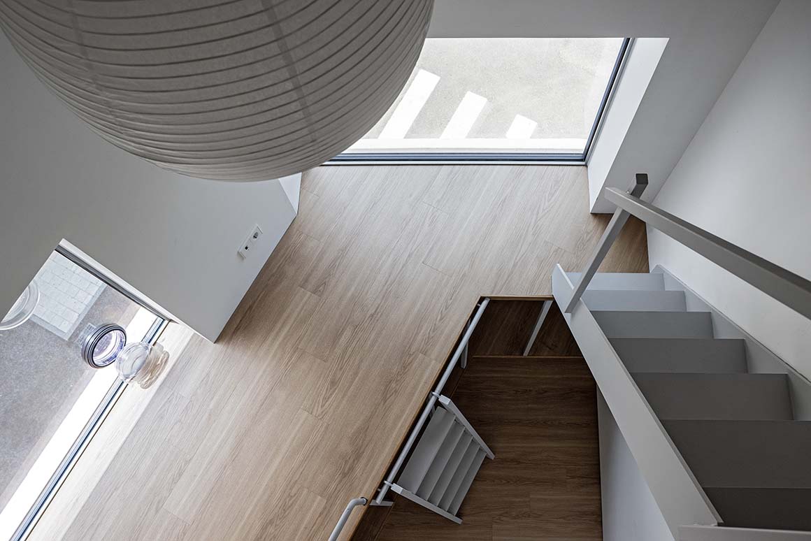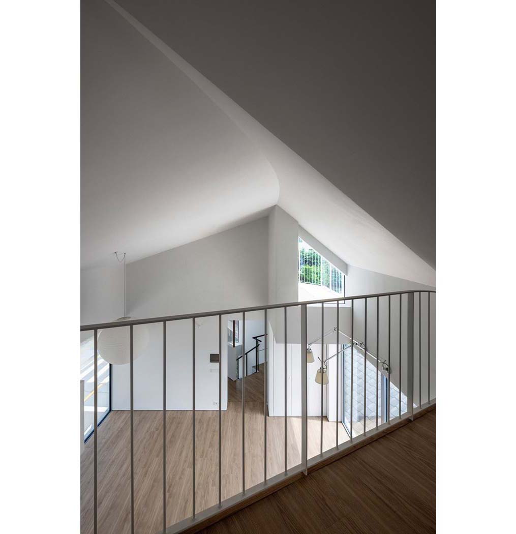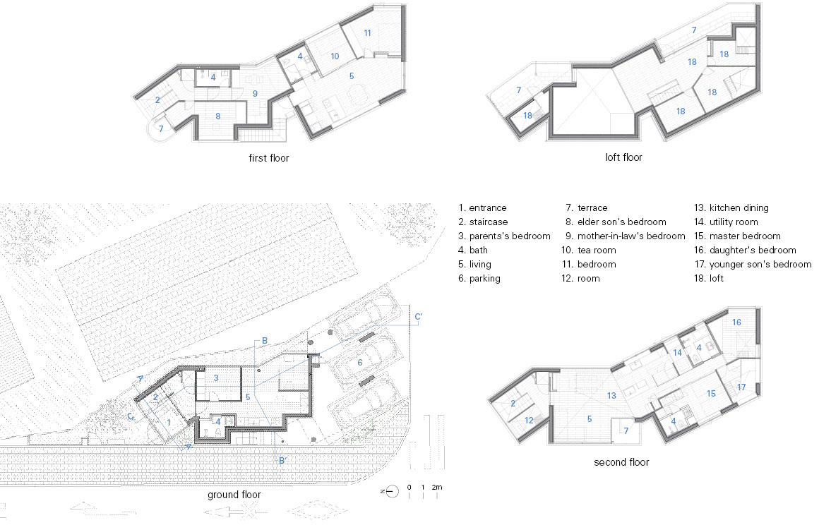 The building is composed as a gathering of several small houses. These small houses are assembled with slight offsets; the misalignments distinguish each unit while also allowing the house to open more fully toward a village-like condition. A small courtyard becomes the exterior entrance for the tenant household on the second floor, and a two-sided open terrace on the third floor. The houses, slightly shifted and spaced apart, can look toward one another. The first floor is used by the client’s parents, the second by the mother-in-law and eldest son, with a separate area on the same level for the tenant household, and the third floor by the client couple and the other children. The living and dining areas on the third floor are shared by all.