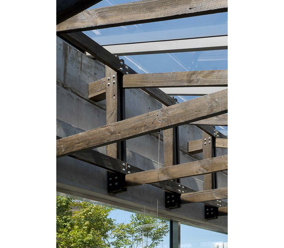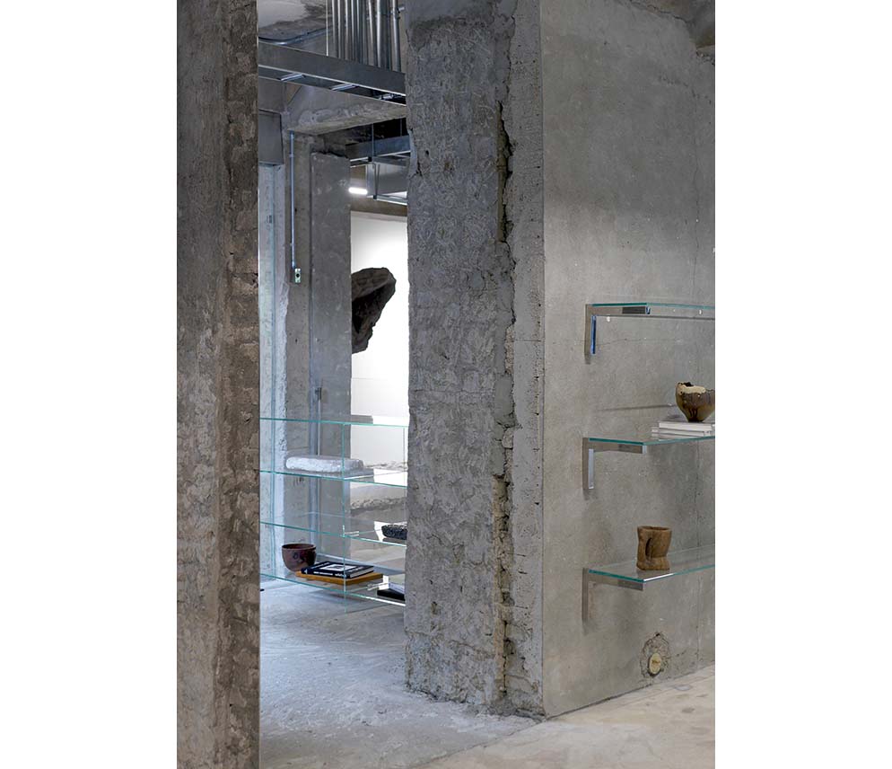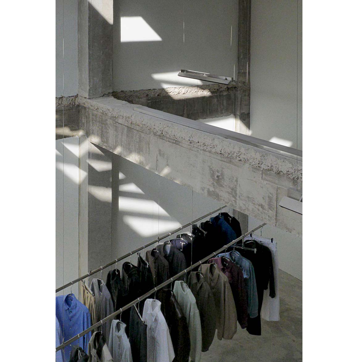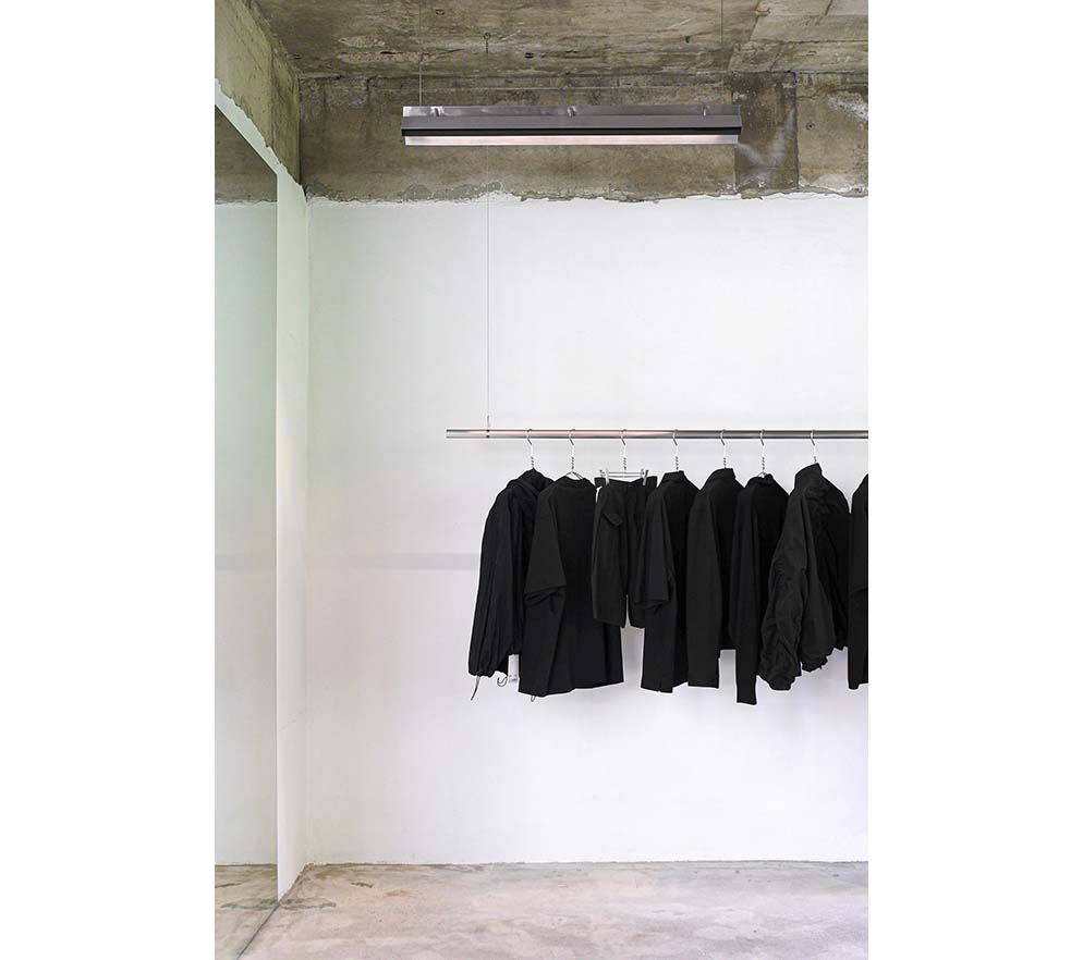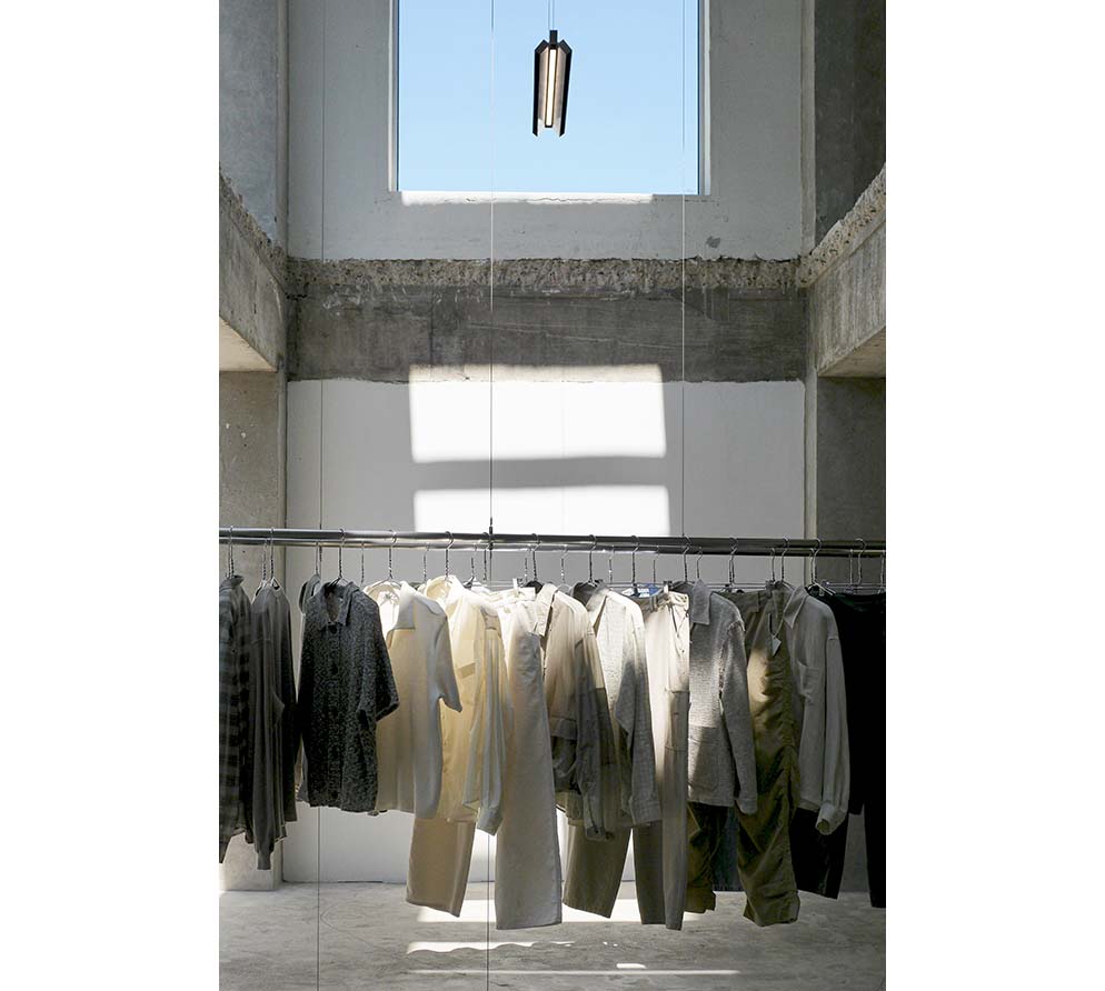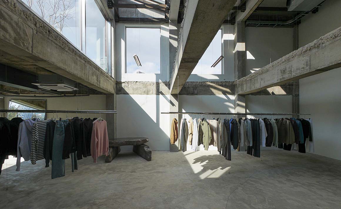 Slabs left in uneven portions generate unexpected three-dimensional situations between levels. The first and second floors read as a single volume in which light and air intermingle, and the traces of the existing structure—beams and columns—are left exposed without cosmetic concealment. Against this rough structural ground, visitors’ movements overlap, while garments on suspended rails cut across the void and lend the space a measured visual rhythm. When one looks up, multiple ceilings come into view at once; only then does the spatial logic fully register—different floors are not discrete episodes but interconnected scenes held within a single field of vision.