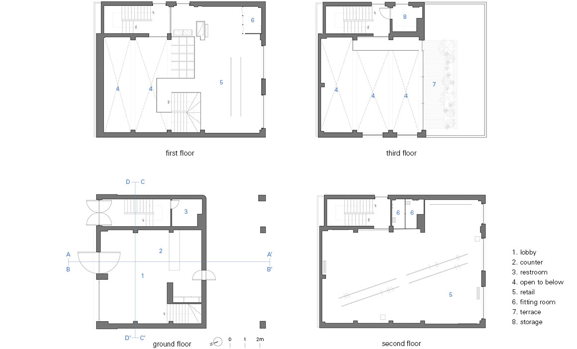 Project: COOR Seongsu Flagship Store / Location: 1-4F, 14-2, Yeonmujang-gil, Seongdong-gu, Seoul, Republic of Korea / Architect: Atelier KHJ / Project team: Hyunjong Kim, Chaewon Kang, Jihyeong Lee / Contractor: Sewon Design / Client: COOR / Use: fashion showroom / Gross floor area: 520.95m² / Completion: 2023 / Photograph: courtesy of the architect