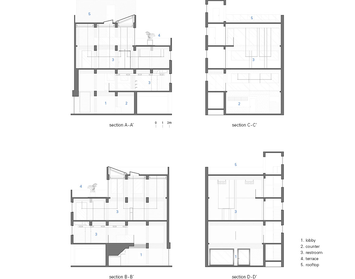 Here, the architect prioritises the depth of experience over spatial efficiency. Half of the second-floor slab and roughly two-thirds of the fourth-floor slab were removed. The result is a concentrated vertical void that physically penetrates four storeys while being perceived—through proportion and compression—closer to a two-storey scale. This is not emptiness for its own sake, but a spatial device: a way of translating the horizontal limits of retail into vertical openness.