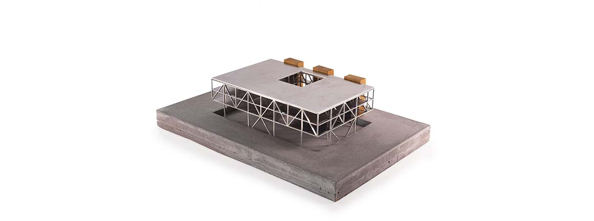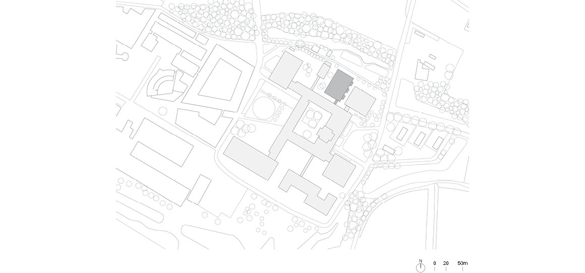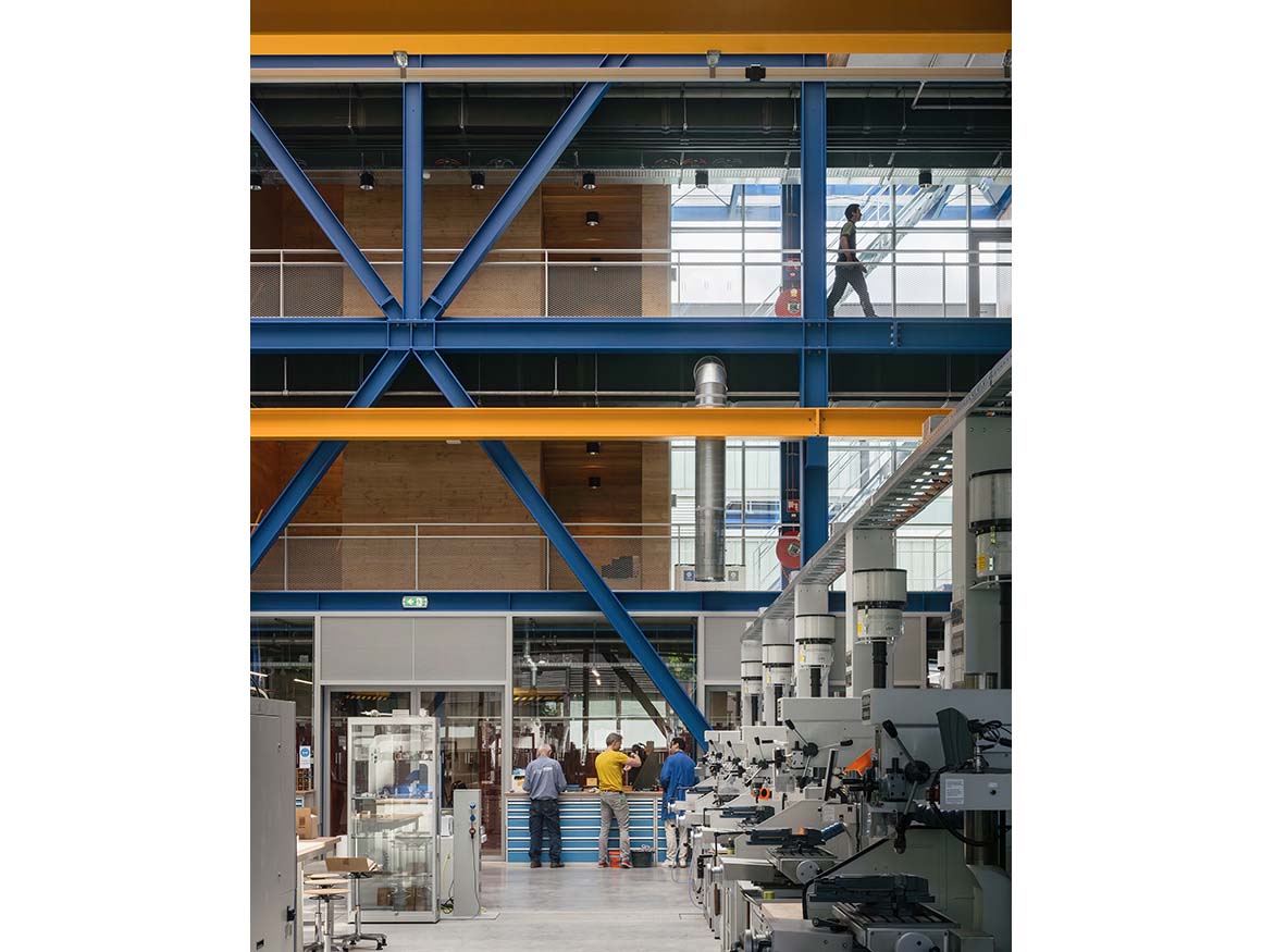 The seven-meter-high metal welding workshop adopts a sunken configuration, with the floor set 1.4 meters below ground level, allowing views across the machinery and throughout the space. Below, students and researchers operate equipment, while above, prototypes are developed and classes are held against the backdrop of the campus landscape. Within a compact floor plan, workshops for welding, metalworking, model making, and assembly, together with laboratories and measuring spaces, are stacked vertically to encourage interaction and visual exchange among users.