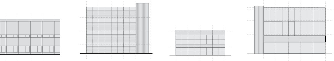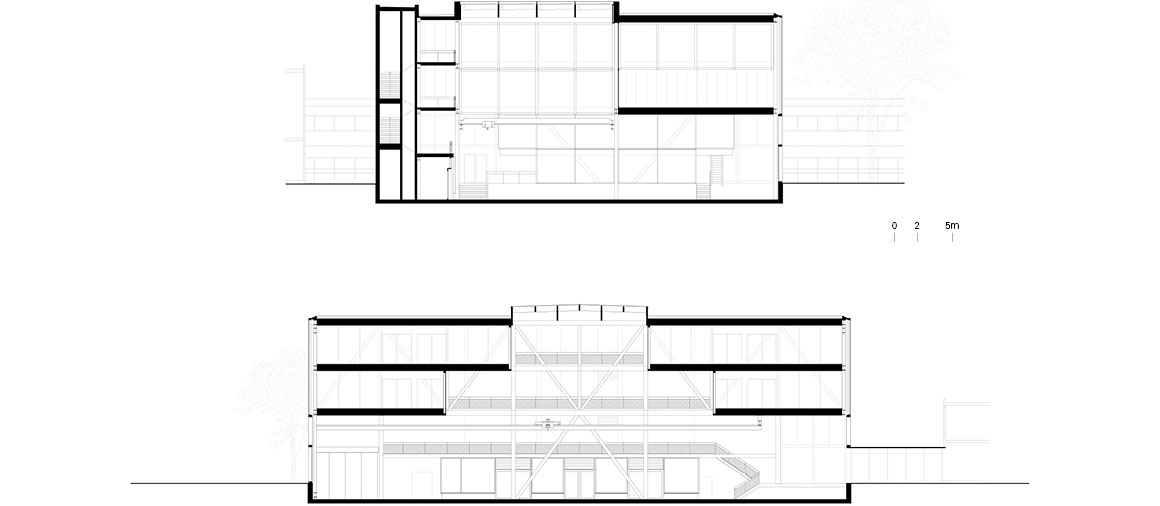 The three cores reinterpret the former tower buildings, acting as vertical elements that articulate and lighten the reading of the linear mass. At the lower levels, the facade overlooking the sunken interior is finished in wood between glazed surfaces, adding texture and material warmth. Above, a glass curtain wall reveals the steel trusses beyond, where their geometry intersects with the orthogonal facade, lending the exterior a sense of dynamism.