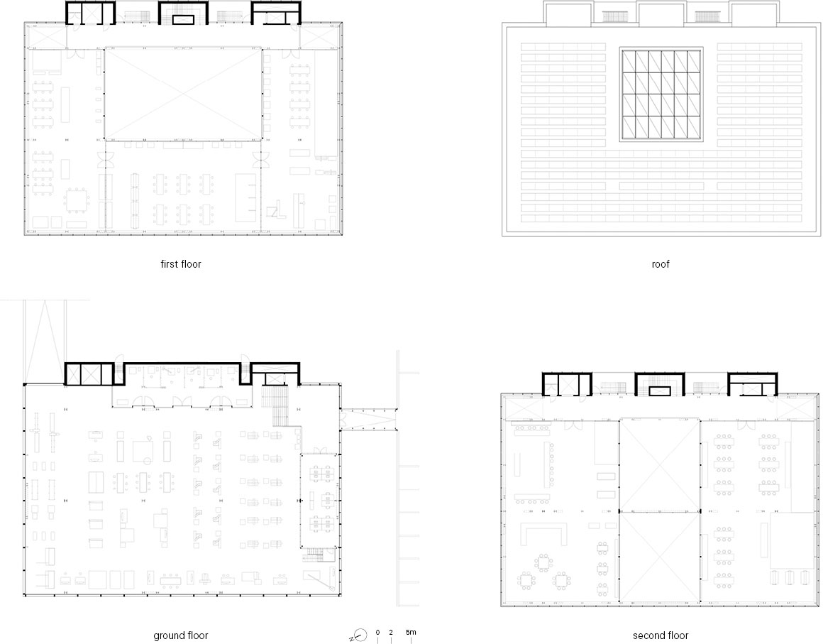 Flexibility of use was a key requirement of the project. This was achieved through long structural spans and high load-bearing performance. The plan is organized into two primary zones, each 14 meters wide, and a narrower zone that functions as a structural and service backbone. The entire layout is supported by three cores, while two-story-high steel trusses reduce the number of interior columns. The resulting combination of open, column-free spaces supported by cores and trusses forms a powerful architectural gesture derived from the need for adaptability.