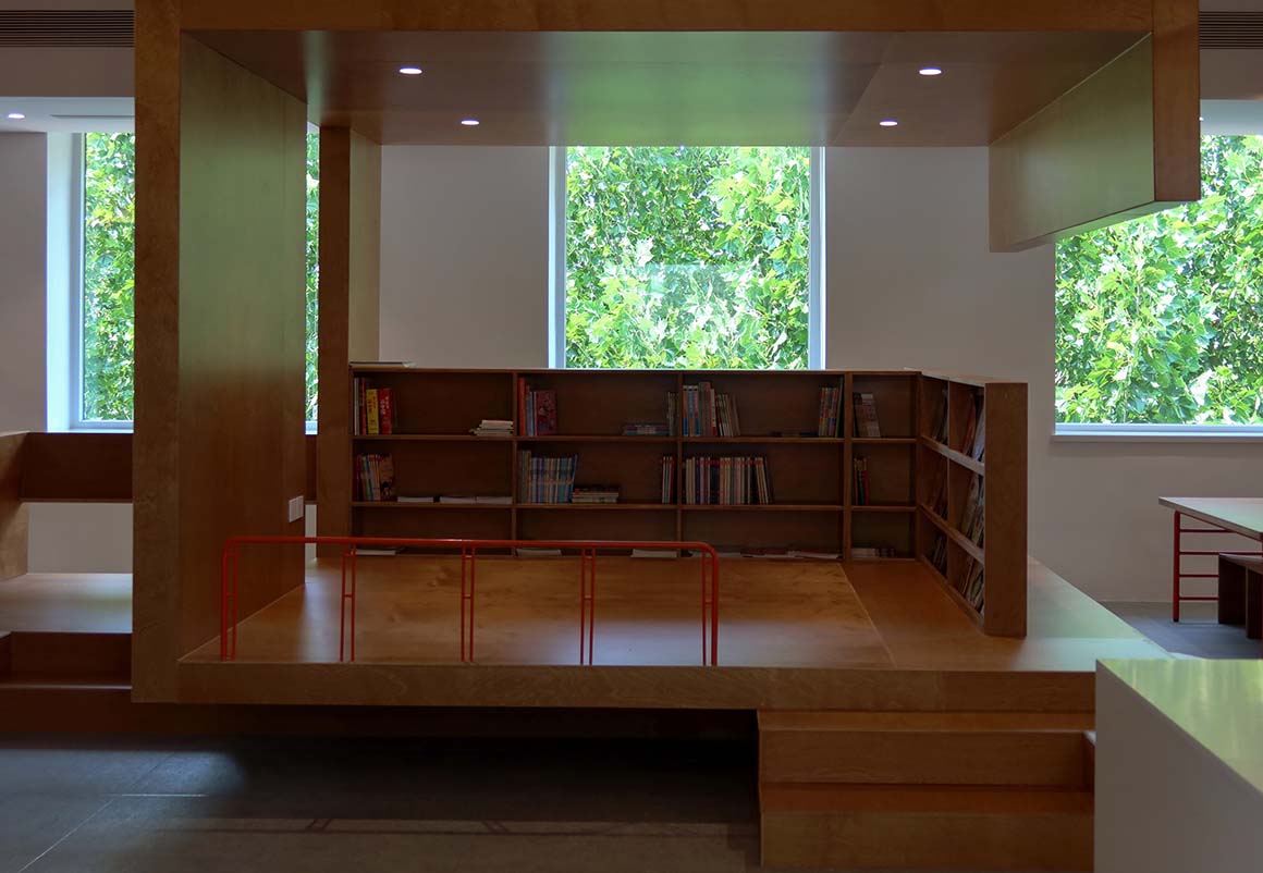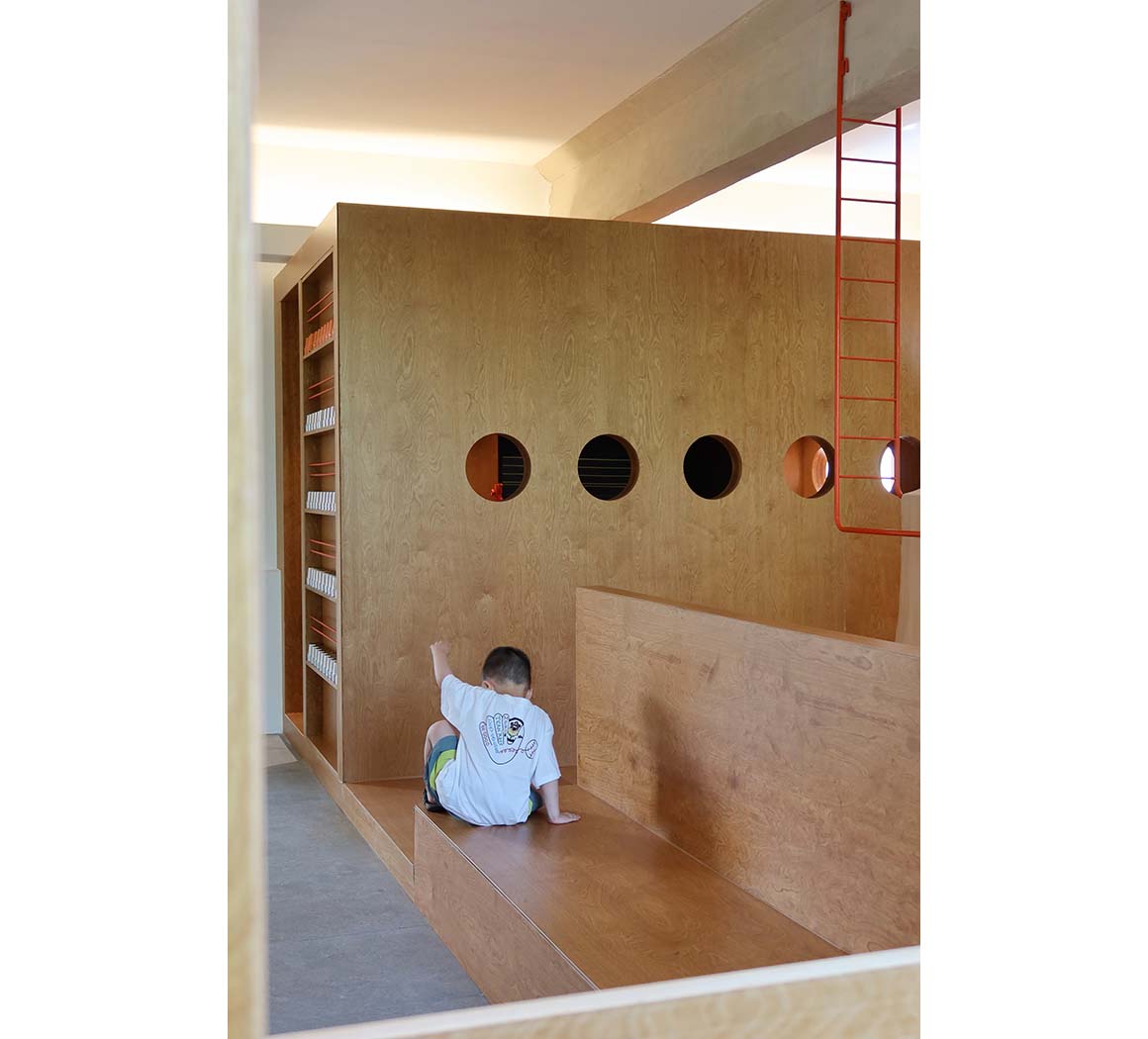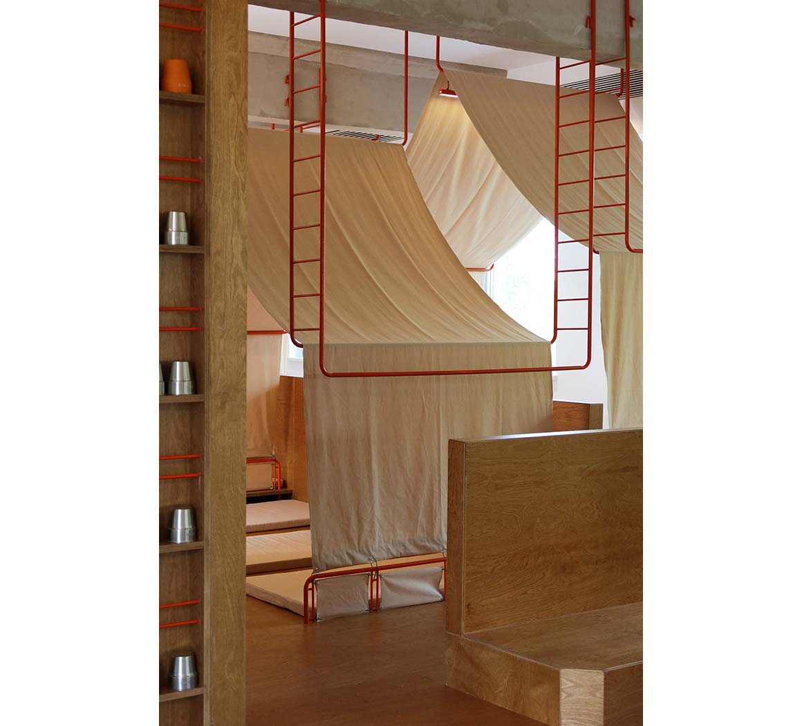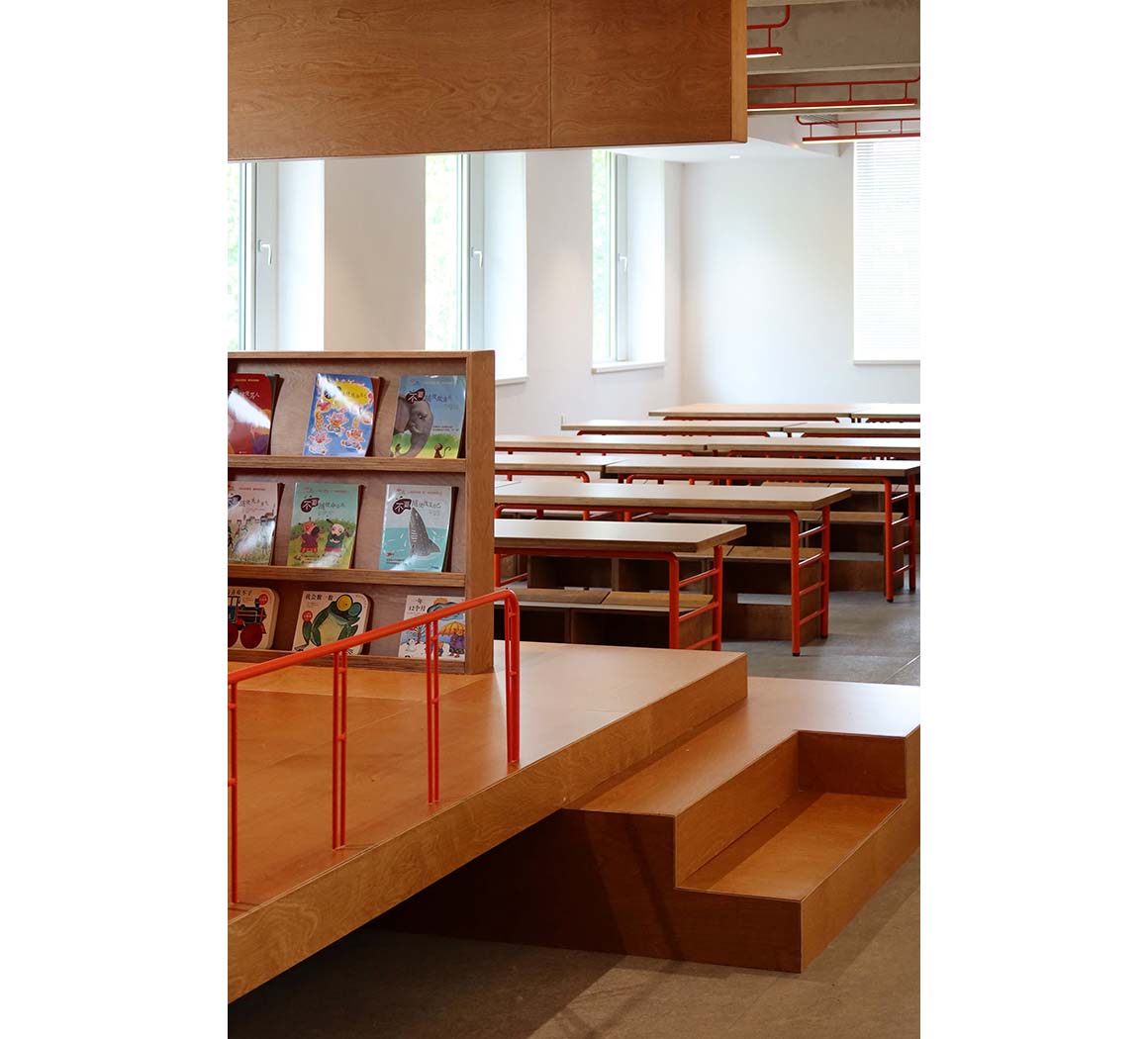 A stepped field of timber platforms organizes the interior. The level changes are not simply resolved; they are made productive. As the tents “cascade” across different heights, circulation becomes movement with purpose—climbing, walking, pausing—turning the act of getting somewhere into play. The platform edges are used as open bookshelves, keeping materials within easy reach. At midday, the same platforms shift roles again, becoming nap surfaces. With a small number of elements, the design accommodates the daily cycle of activity and rest as part of a single spatial continuum.