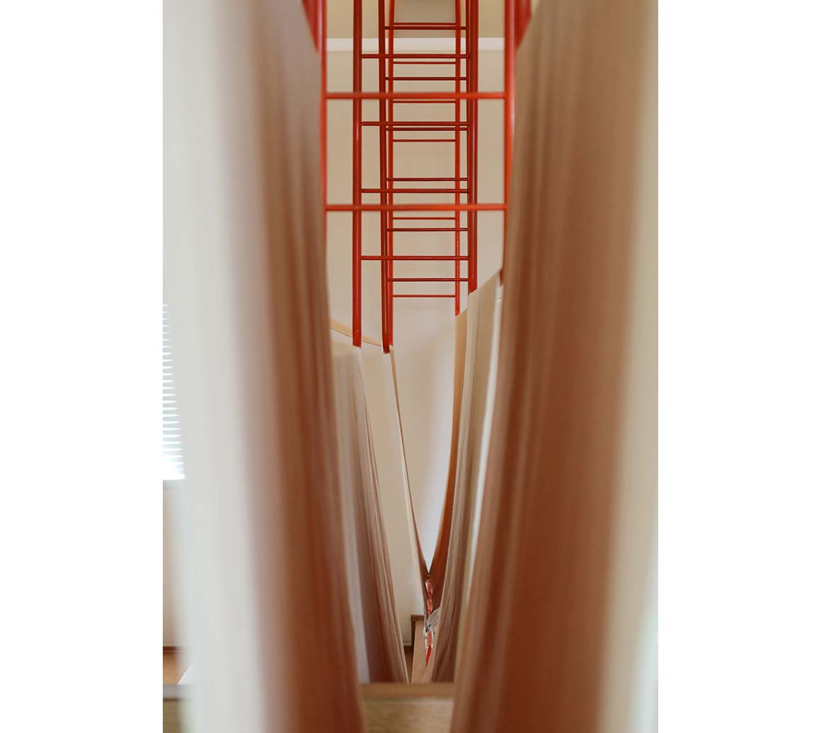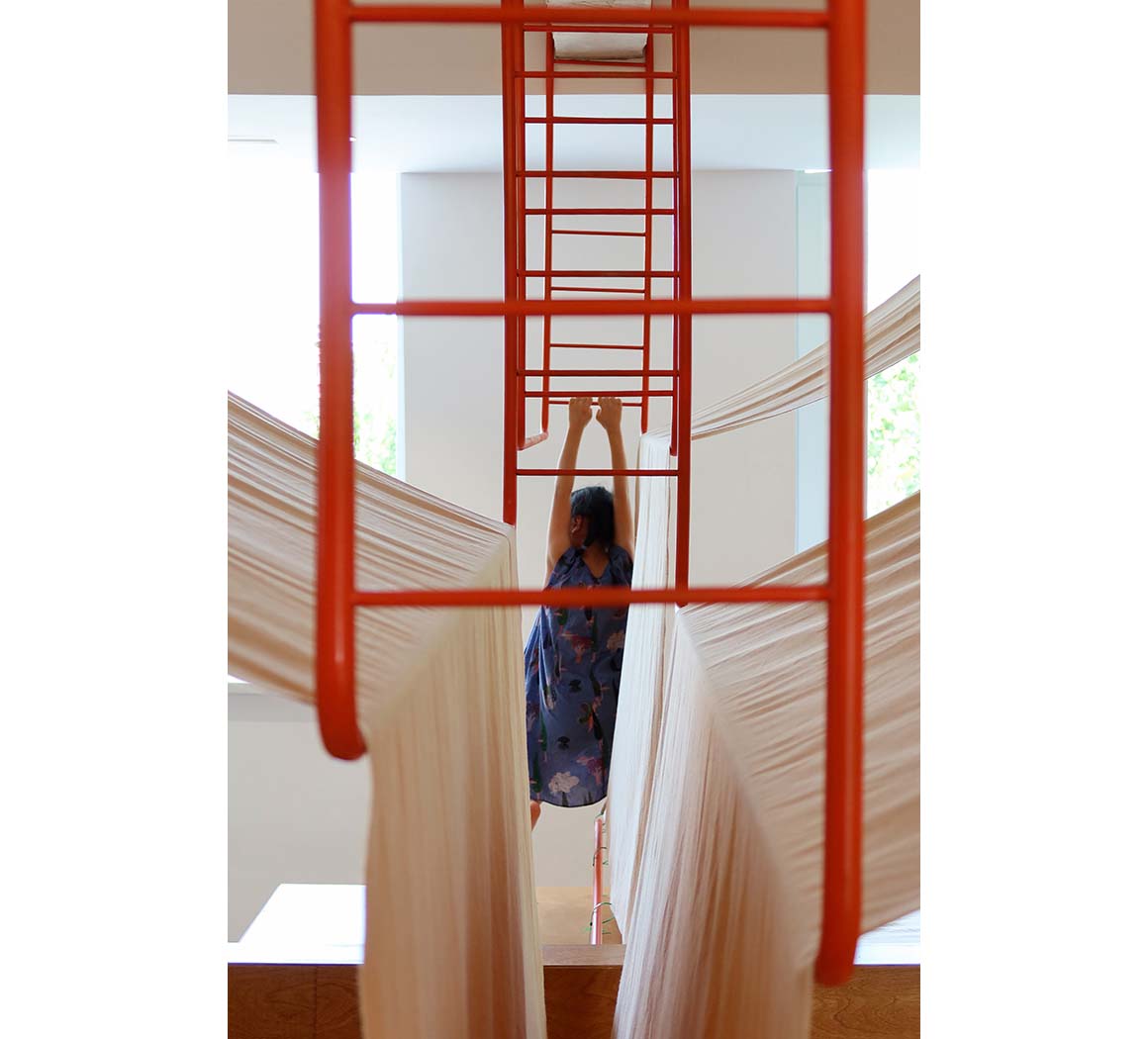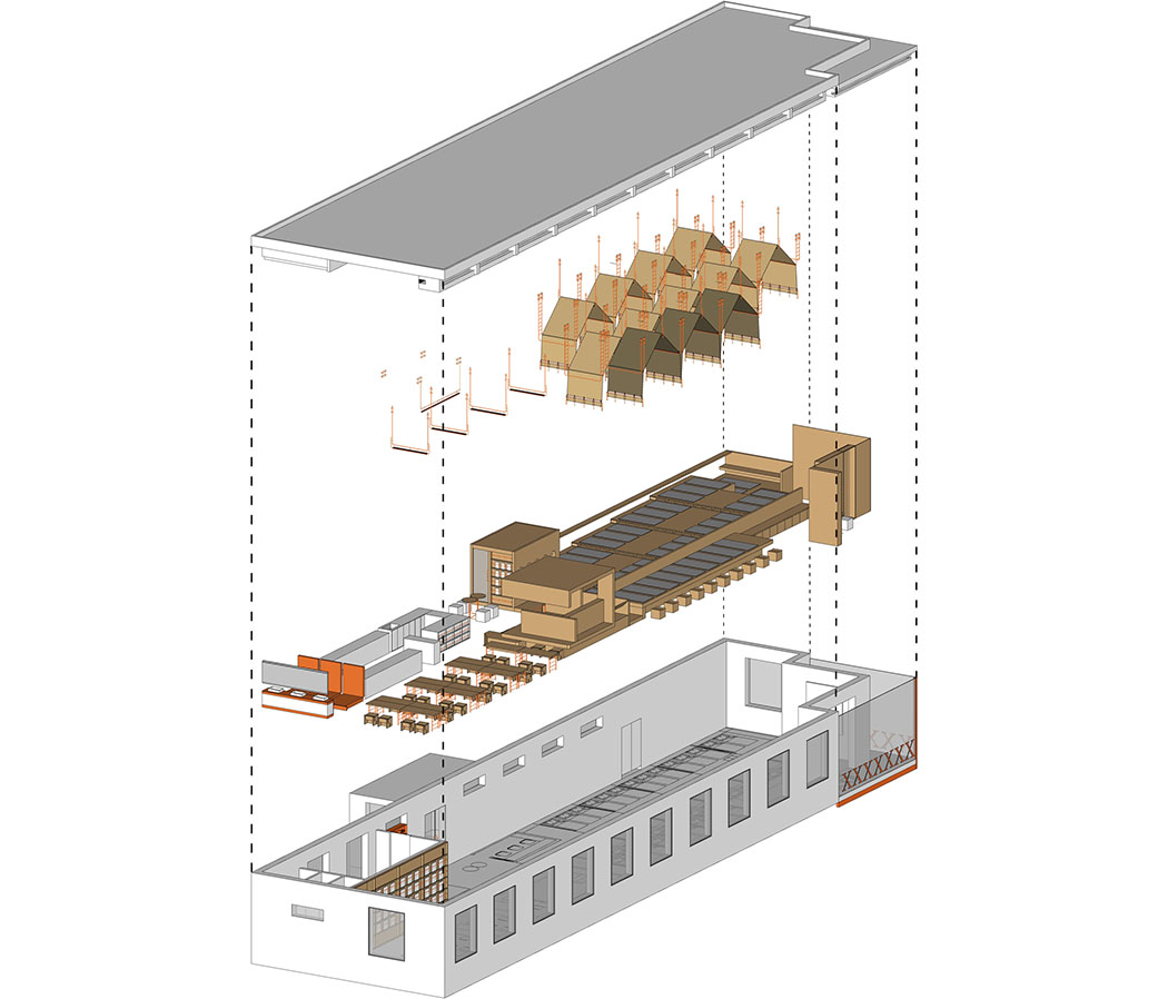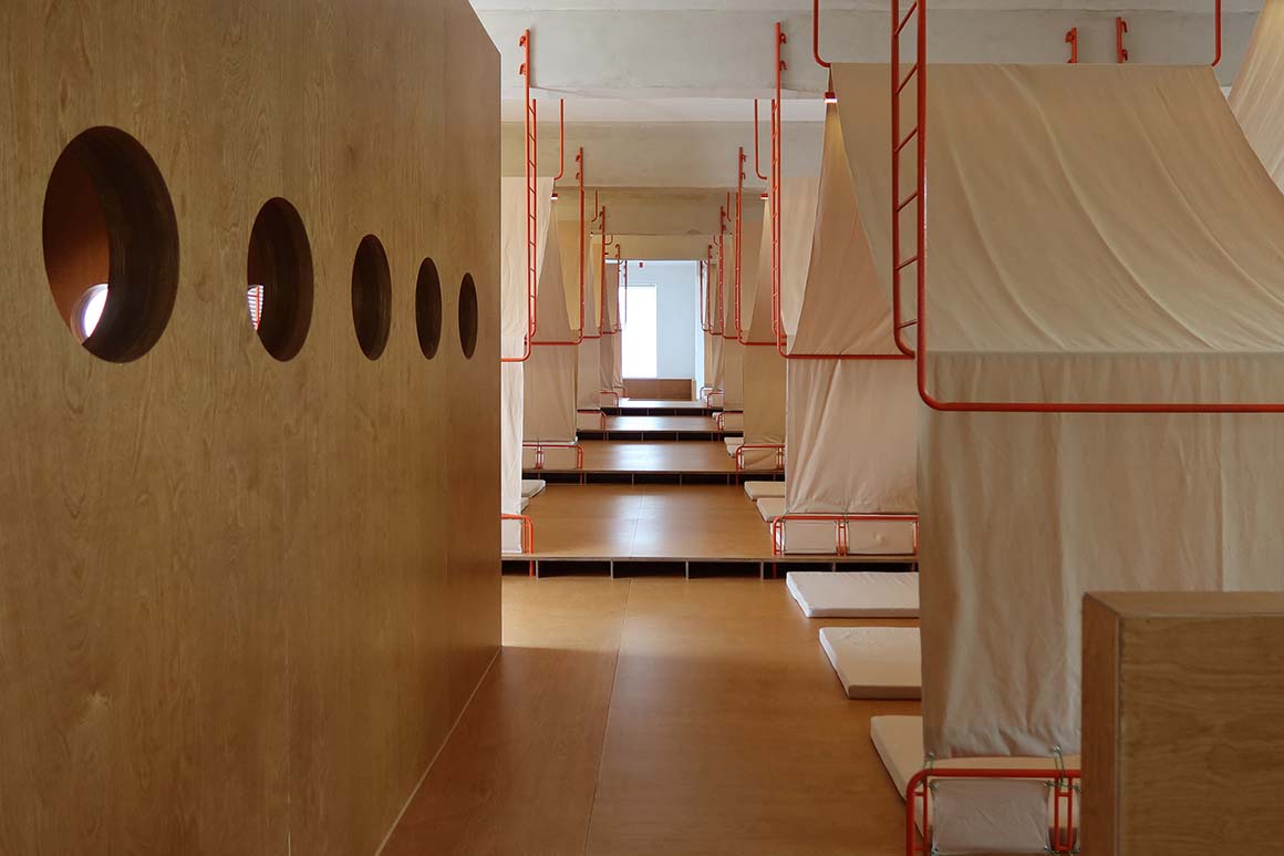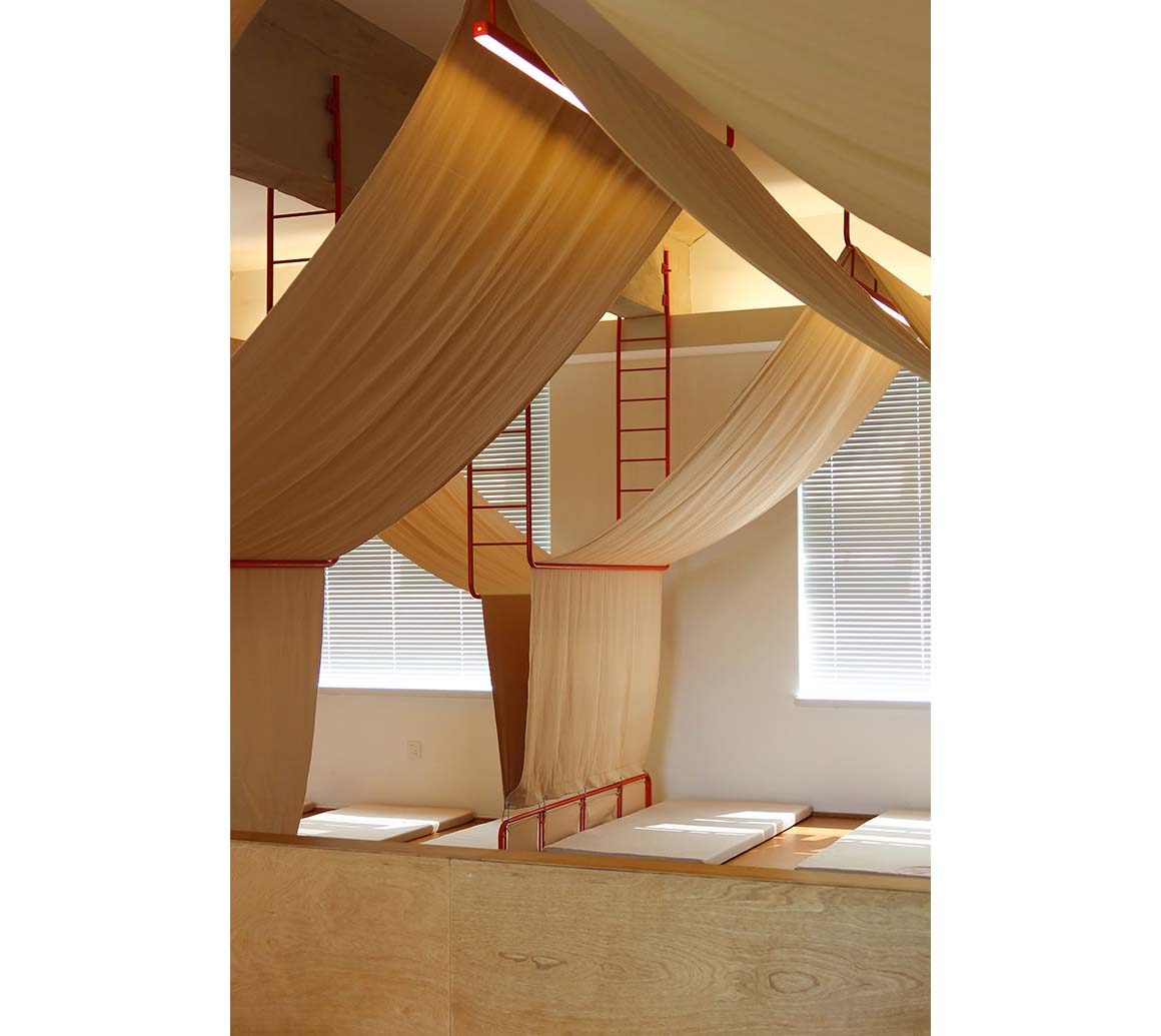 A stepped field of timber platforms organizes the interior. The level changes are not simply resolved; they are made productive. As the tents “cascade” across different heights, circulation becomes movement with purpose—climbing, walking, pausing—turning the act of getting somewhere into play. The platform edges are used as open bookshelves, keeping materials within easy reach. At midday, the same platforms shift roles again, becoming nap surfaces. With a small number of elements, the design accommodates the daily cycle of activity and rest as part of a single spatial continuum.