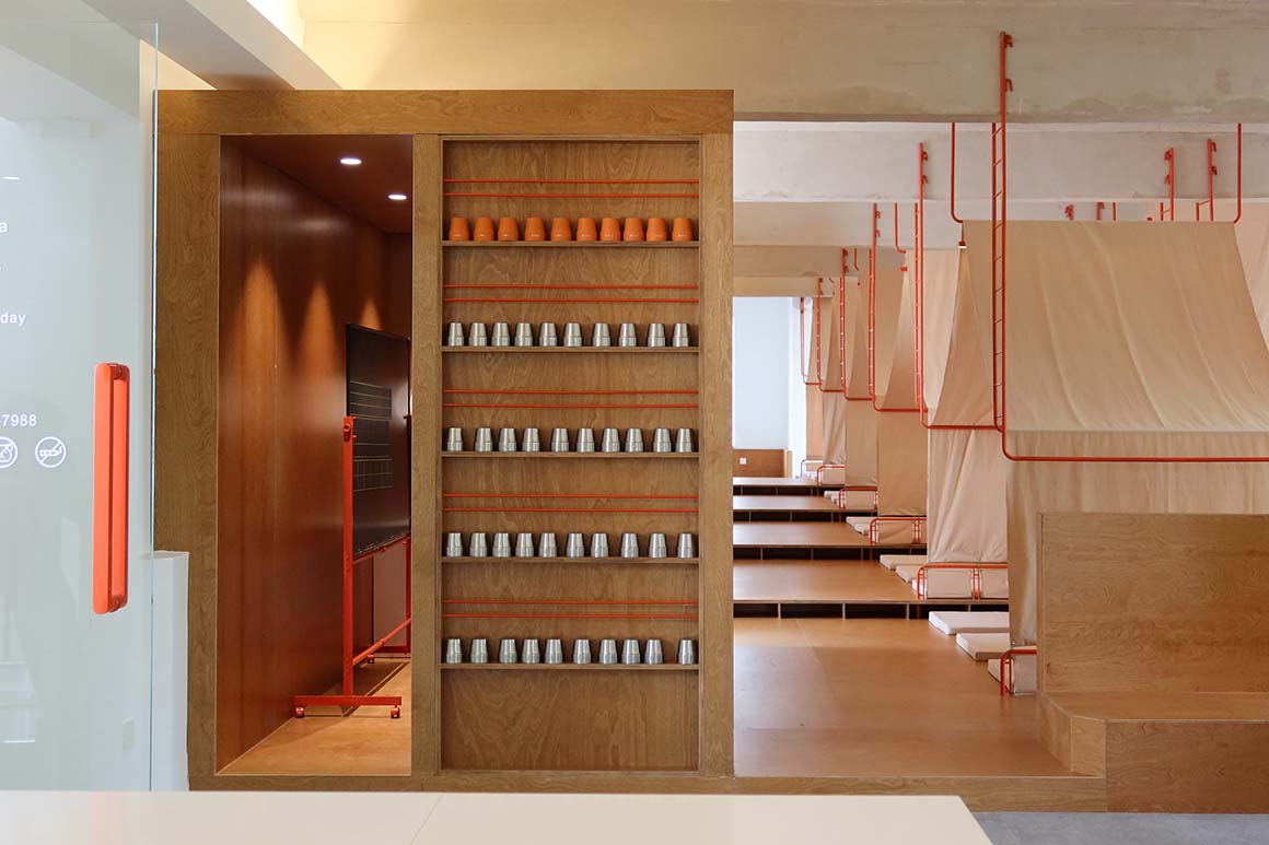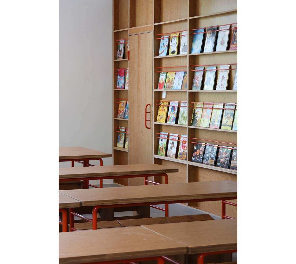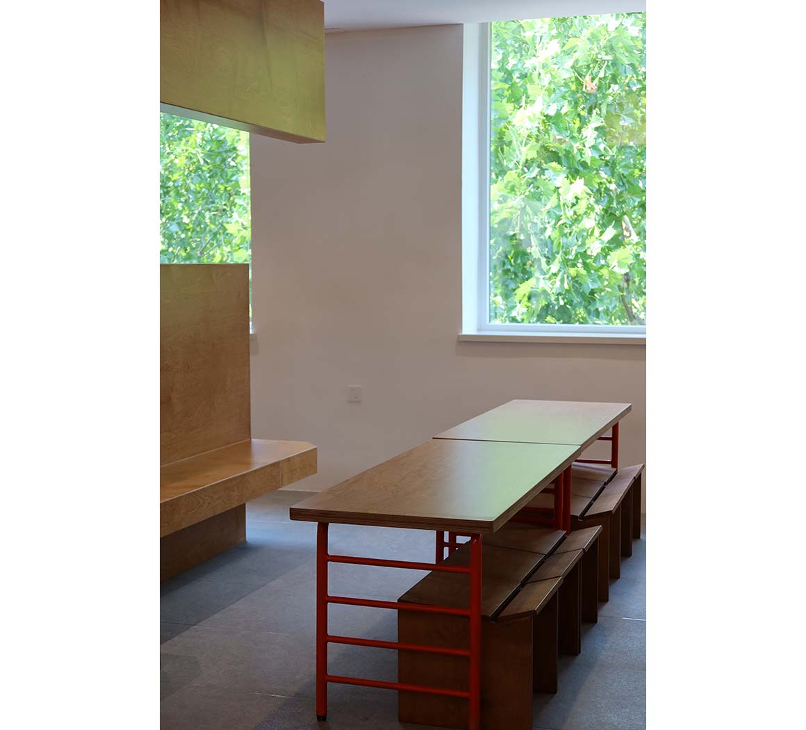 Material and construction choices reinforce this clarity. Plywood, canvas, and standard steel pipe—readily available and cost-effective—are used to establish a consistent structural logic and a unified visual system. Furniture and fittings follow the same grammar: desks, blackboard stands, handles, and cup holders are all resolved through similar details and fabrication methods. The result is an environment children can “read” intuitively, where how things are made is visible and understandable. 11-Design describes this approach as an “aesthetic of honesty”—a deliberate avoidance of unnecessary ornament in favor of direct relationships between structure, function, and experience.
